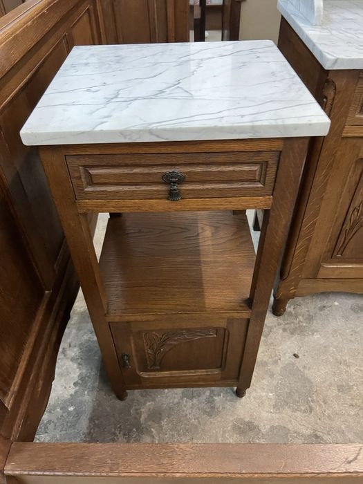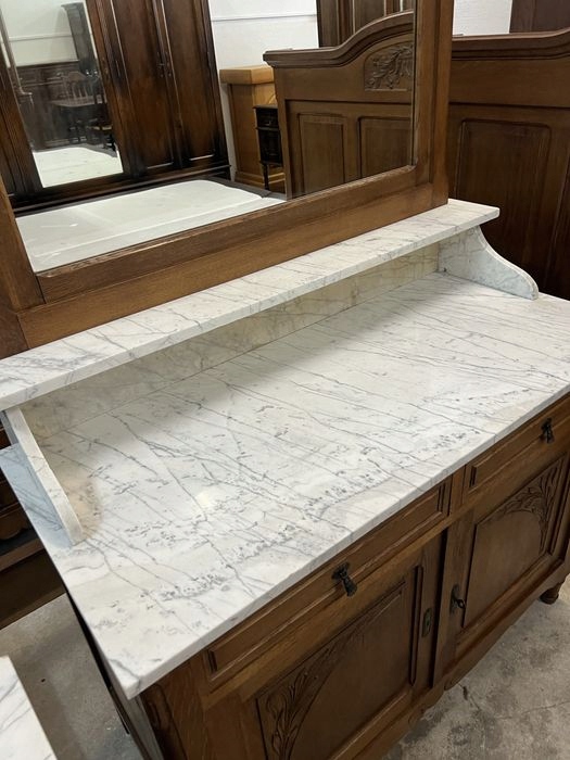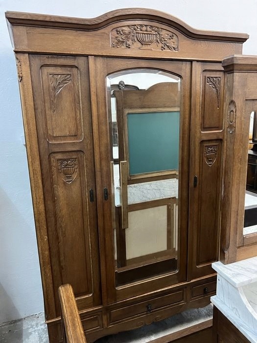 Предметом продажи является очень красивая спальня в стиле модерн, состоящая из: шкафа, кровати с каркасом, туалетного столика с мраморной столешницей и прикроватной тумбочки. Общее состояние очень хорошее, учитывая возраст. Рядом со шкафом есть скошенное по бокам зеркало, на нем есть несколько темных точек в одном месте, в остальном оно в очень хорошем состоянии. Возможность покупки в рассрочку. Возможен транспорт или личный самовывоз. Товар доступен в магазине в Пионках.