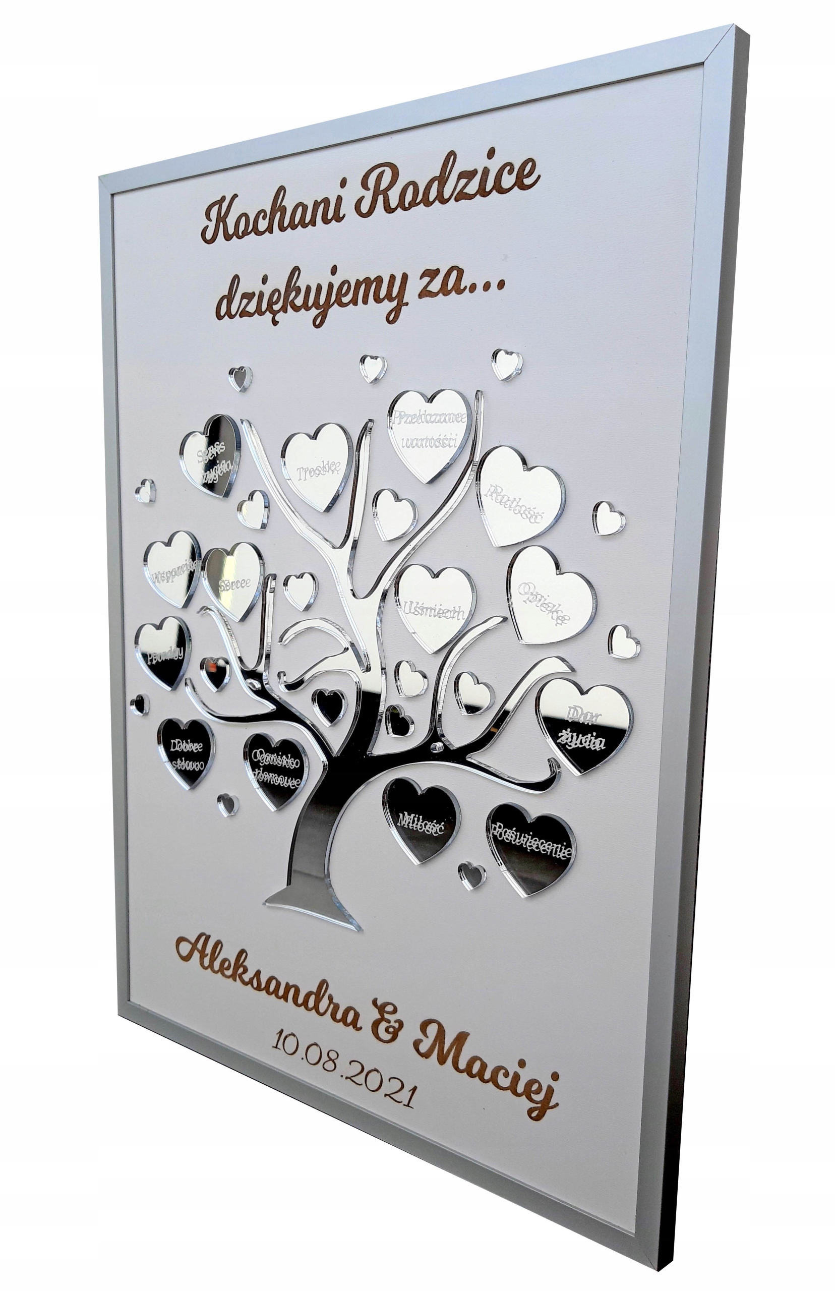 - дерево из зеркального оргстекла серебристого цвета, лазерная гравировка на сердечках.