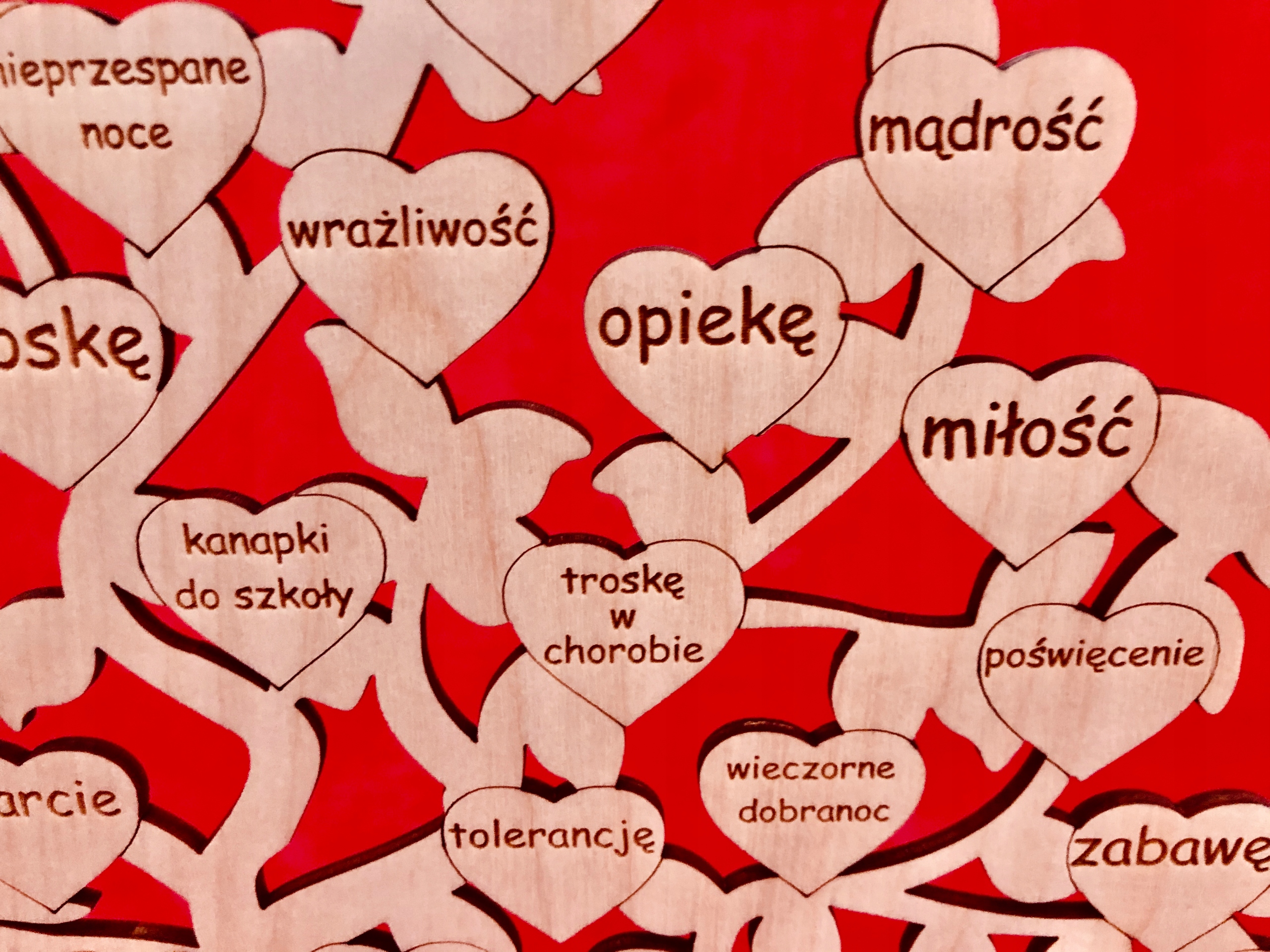 На дереве выгравировано более 30 сердечек с изречениями.