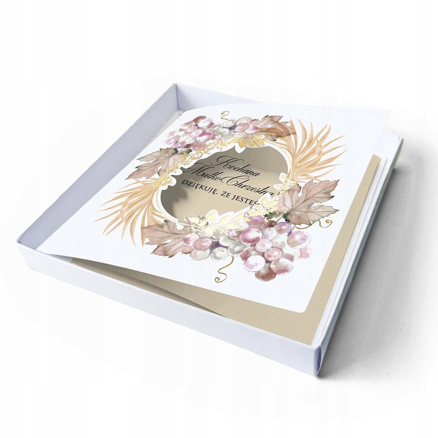 В комплект входит открытка со словами благодарности и декоративная коробка. Подарите Крестной маме красивый сувенир об этом чудесном дне. Крышка украшена принтом растительного мотива в стиле бохо в самых модных земляных тонах. Кроме того, крышка украшена покрытием из настоящего золота. Внутри находится печатная благодарственная записка для Крестной, украшенная цветочным мотивом.