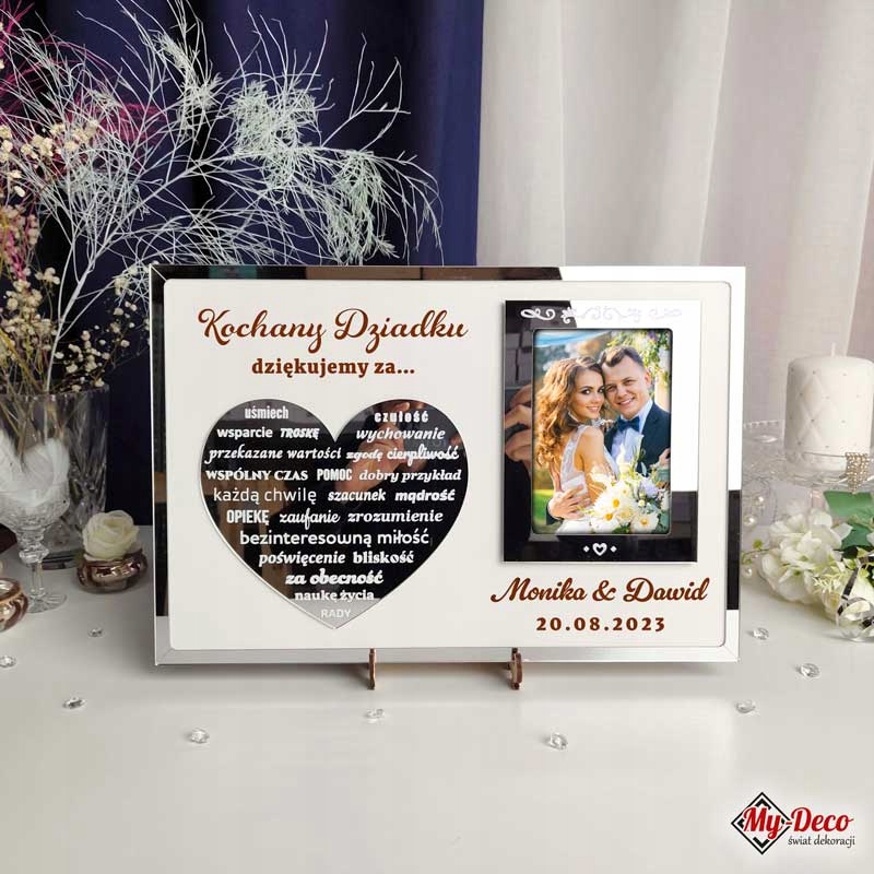 Предлагаемые благодарственные письма крестным, бабушкам и дедушкам изготовлены из высококачественного золотого оргстекла, что придает им элегантность и долговечность. Их уникальный дизайн и изысканные детали делают их идеальным подарком для этого особого случая. Благодарственное письмо имеет форму изящной рамки размером 40х27 см, на которой изображено золотое сердце с написанными на нем благодарственными словами. На доске HDF, на которой основано благодарственное письмо, мы можем выгравировать имена жениха и невесты, дату свадьбы и посвящение - все это выгравировано с использованием новейшей лазерной технологии. Изготовленное из зеркального оргстекла, оно придает блеск и простор, что подчеркивает его уникальность. Благодаря точному исполнению и проработке вплоть до мельчайших деталей, таких как золотые буквы из оргстекла, этот подарок станет прекрасным сувениром на долгие годы. Размер фоторамки 10х15 см.