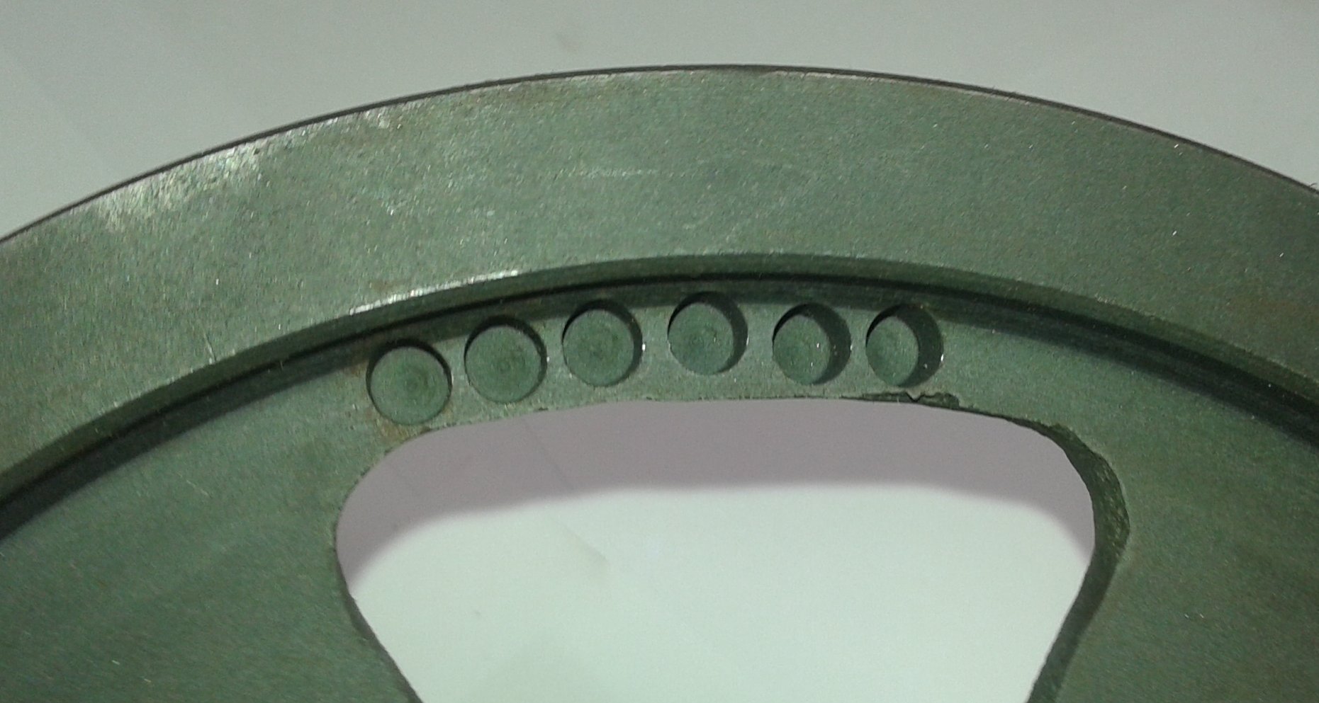 Материал строительства колеса - серое чугун. Круг был фабричным побором в нефть, чтобы сделать защитное покрытие.
