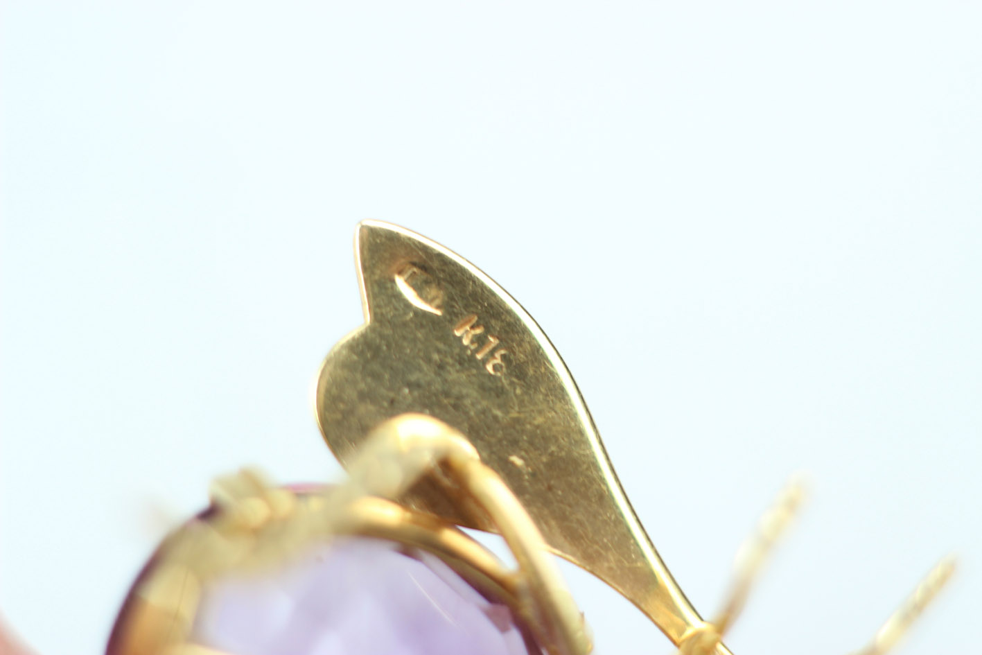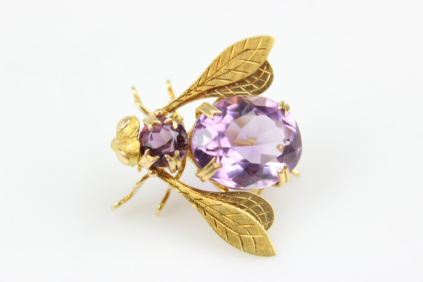 Уникальная брошь 1950-1960-х годов в виде галстука-бабочки, являющаяся повторением викторианских изделий. Брошь изготовлена из высококачественного золота 750 пробы, подписана на нижней стороне крыла штампом 18 карат и украшена натуральными ограненными аметистами. Брошь в идеальном состоянии. Застежка с дополнительной защитой, предотвращающей случайное расстегивание и потерю. Размеры: