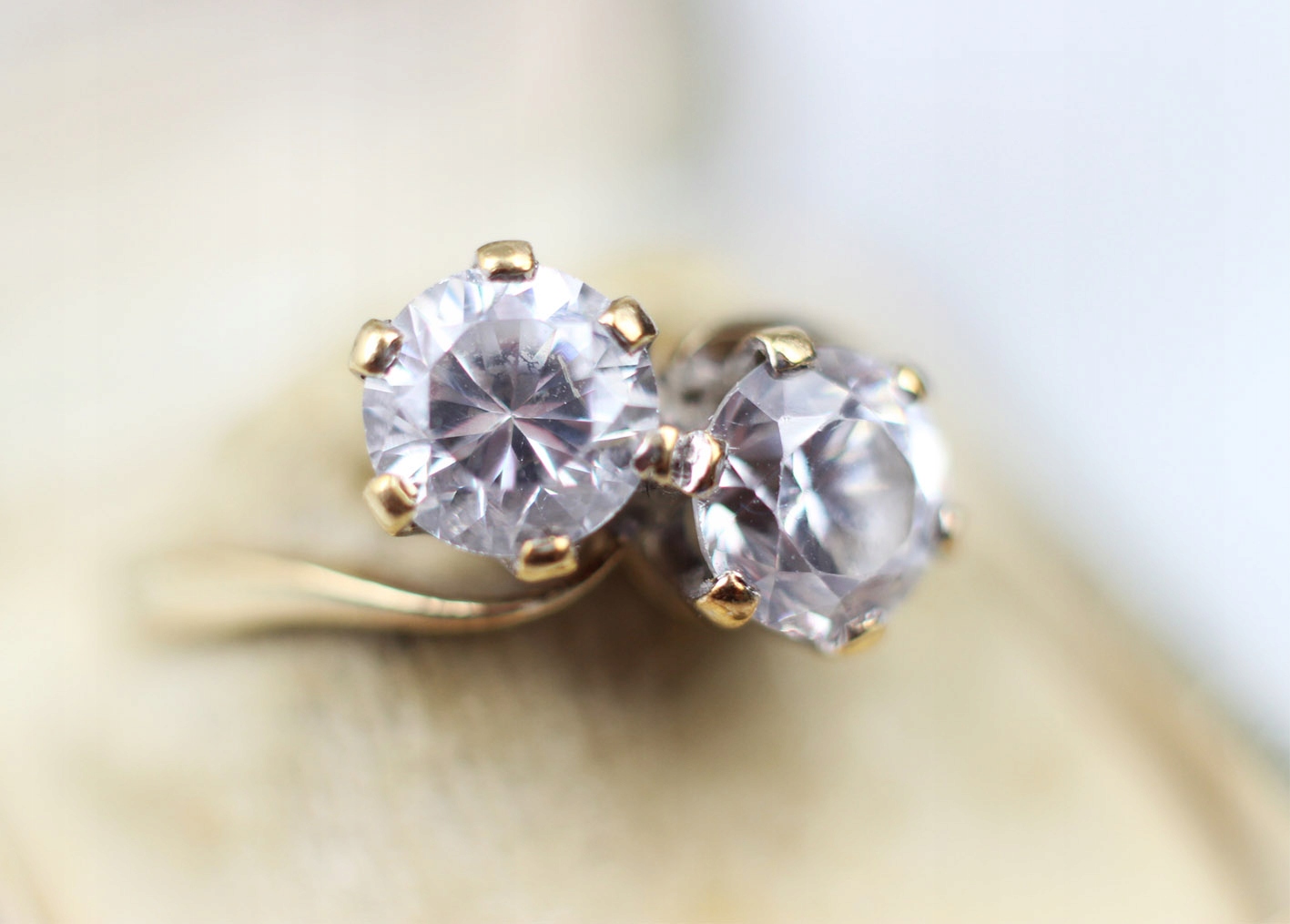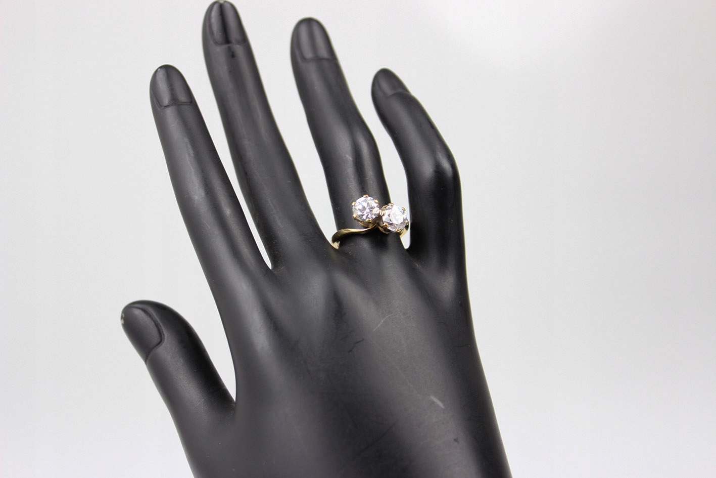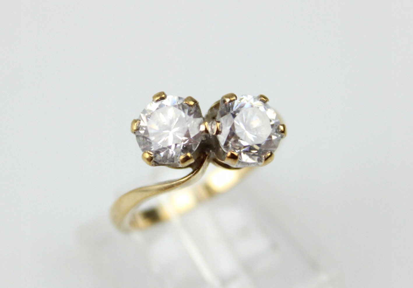 Очаровательное английское кольцо из 9-каратного золота (марка 375) с сильно развитой головкой, центральную часть которой занимают два циркона круглой бриллиантовой огранки, великолепно имитирующие бриллианты. Общий расчетный вес камней составляет примерно 4,07 карата. Очень хорошее состояние. Размеры: