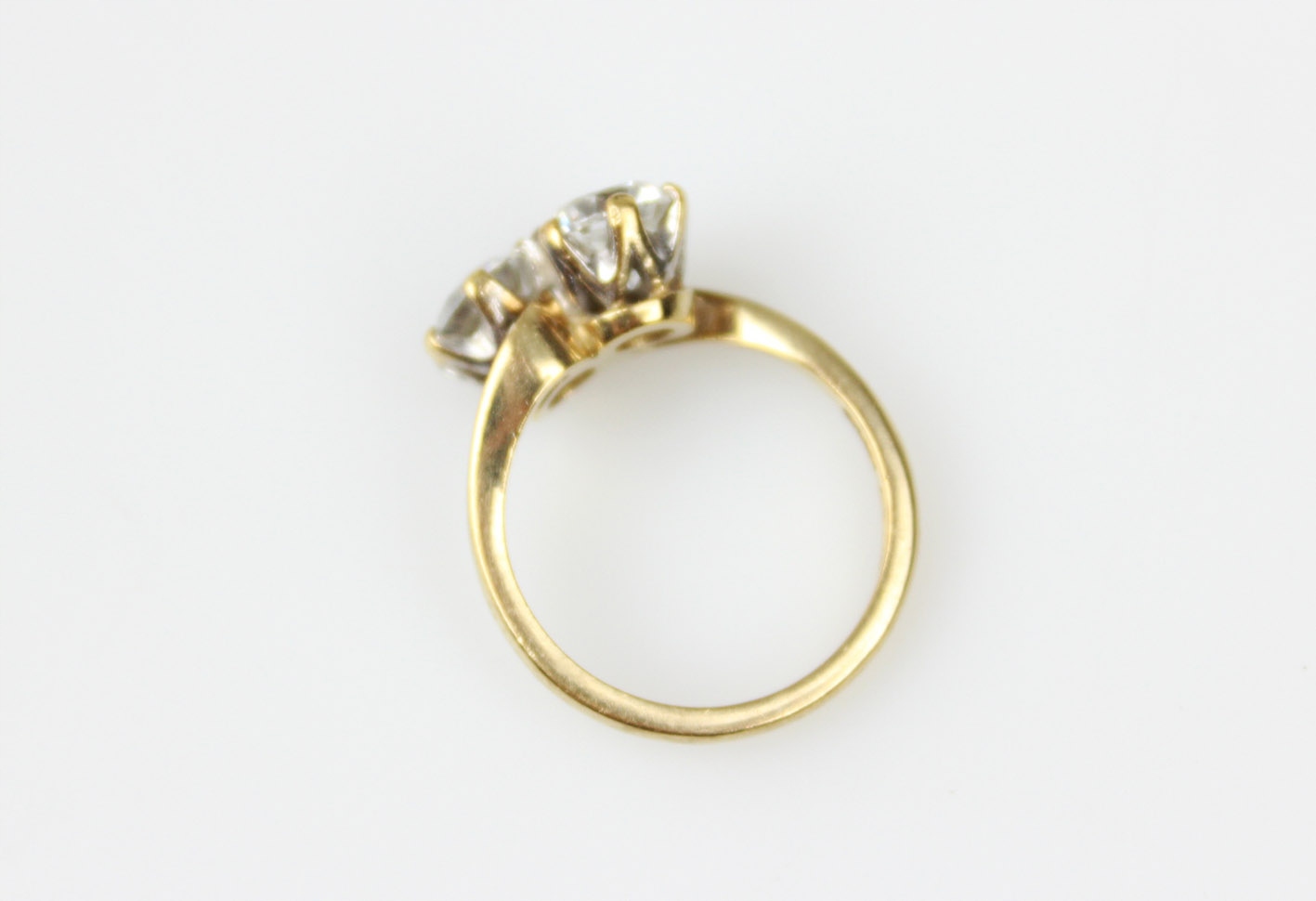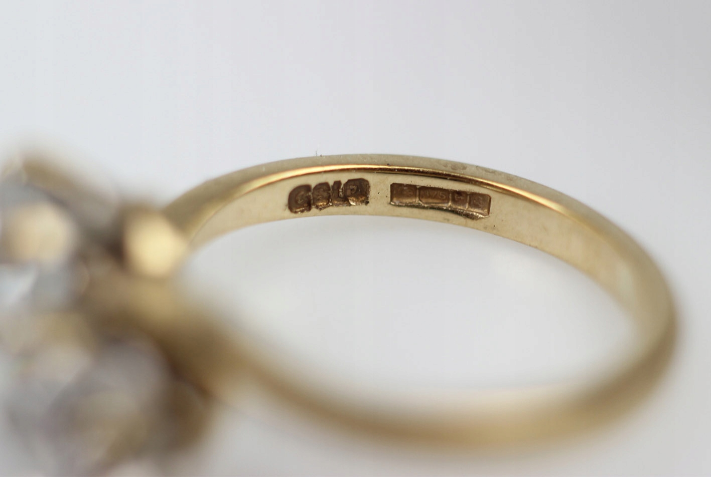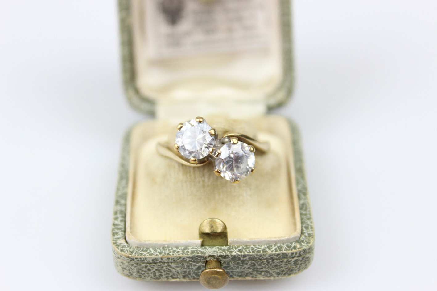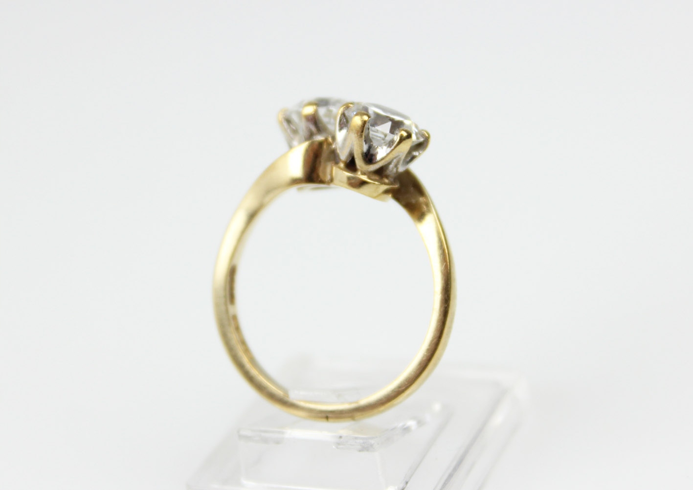 Очаровательное английское кольцо из 9-каратного золота (марка 375) с сильно развитой головкой, центральную часть которой занимают два циркона круглой бриллиантовой огранки, великолепно имитирующие бриллианты. Общий расчетный вес камней составляет примерно 4,07 карата. Очень хорошее состояние. Размеры: