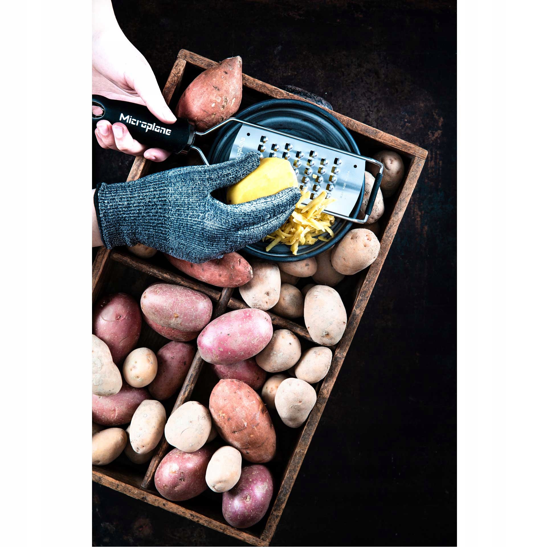 Перчатка Microplane эффективно защищает от порезов при трении. Изготовлен из специализированной бесшовной, устойчивой к порезам ткани. Его форма универсальна, а значит, подойдет как правшам, так и левшам. Он гибкий и адаптируется к любому размеру руки. Ее можно стирать в стиральной машине при температуре до 60 градусов С. Она эффективно защищает руки от возможных травм (в этом случае повреждается именно перчатка, а не рука). Этот продукт пригоден для контакта с пищевыми продуктами и сертифицирован FDA (Американское продовольственное агентство).