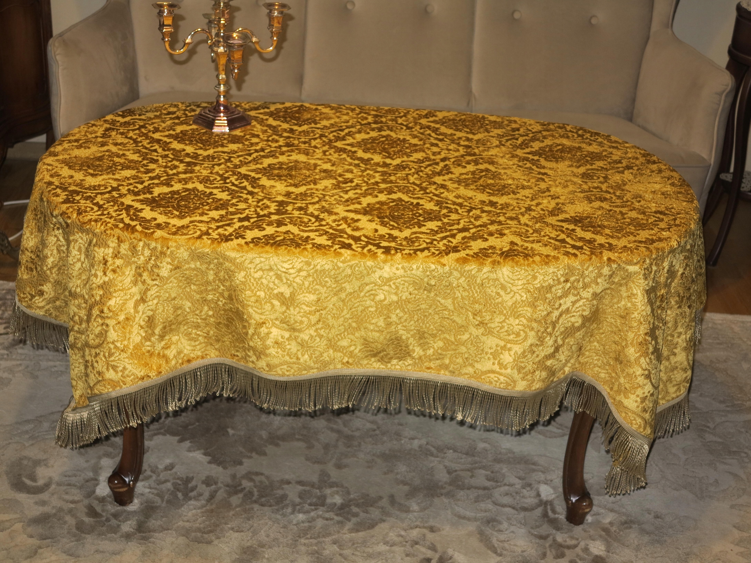ДЛЯ АНТИКВАРИАТА - КРАСИВУЮ, ПРОЧНУЮ И ПЛОТНУЮ СКАТЕРТЬ-ГОБЕЛЕН С ВЫПУКЛЫМ БАРХАТНЫМ УЗОРОМ АКАНТО. СКАТЕРТЬ ЦВЕТА СТАРОЕ ЗОЛОТО, С ЗОЛОТОЙ БАХИРОЙ ВОКРУГ.