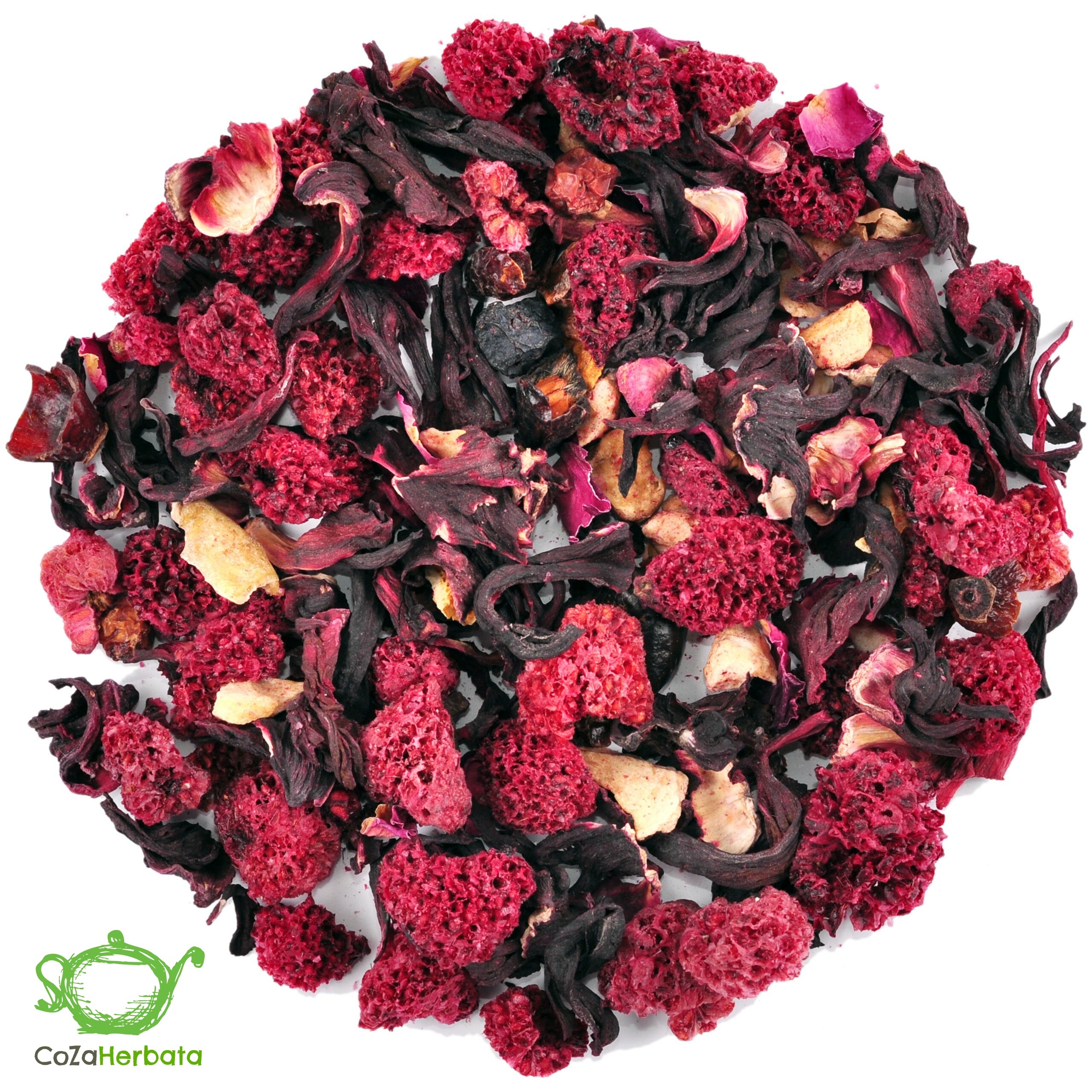 Хибискусные хлопья, фрукты чернорога, яблочные фрукты, кожа дикой розы, малиновые фрукты, роуэн, лепестки роз, апельсиновая кожура