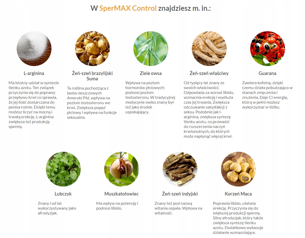 SperMAX Control — это капсульный препарат, содержащий ряд ингредиентов, поддерживающих вашу сексуальную жизнь, благодаря чему ваш секс будет длиться так долго, как вы захотите, а ваша эякуляция увеличится. Мы объединили ряд многовековых растительных веществ с разных континентов, которые поддерживают ваш пол: