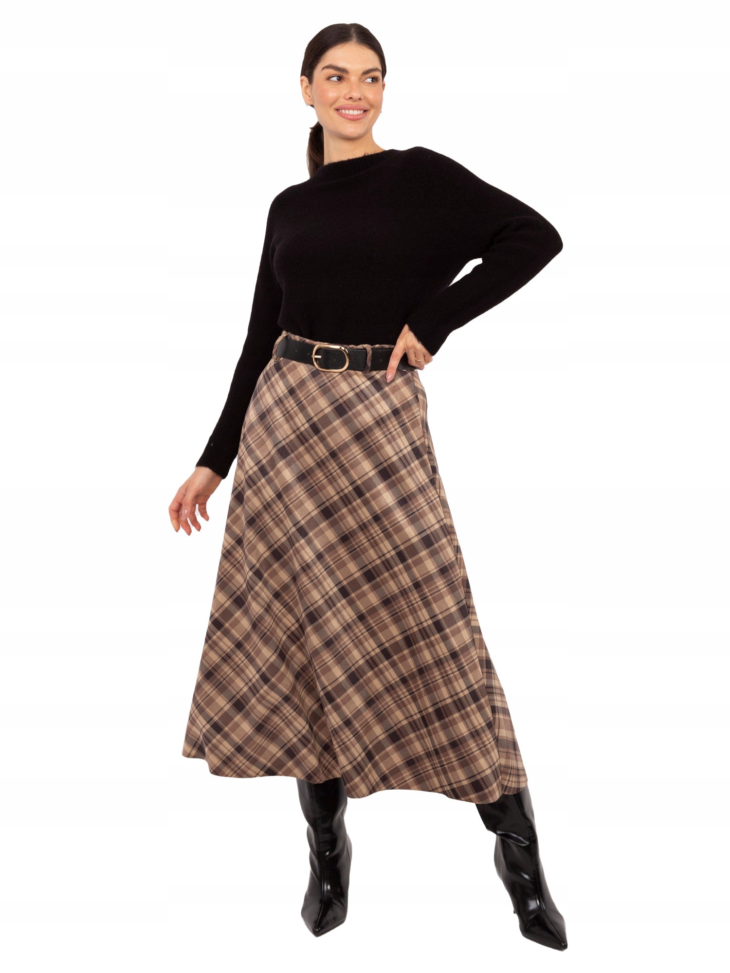Женская повседневная расклешенная клетчатая юбка с поясом