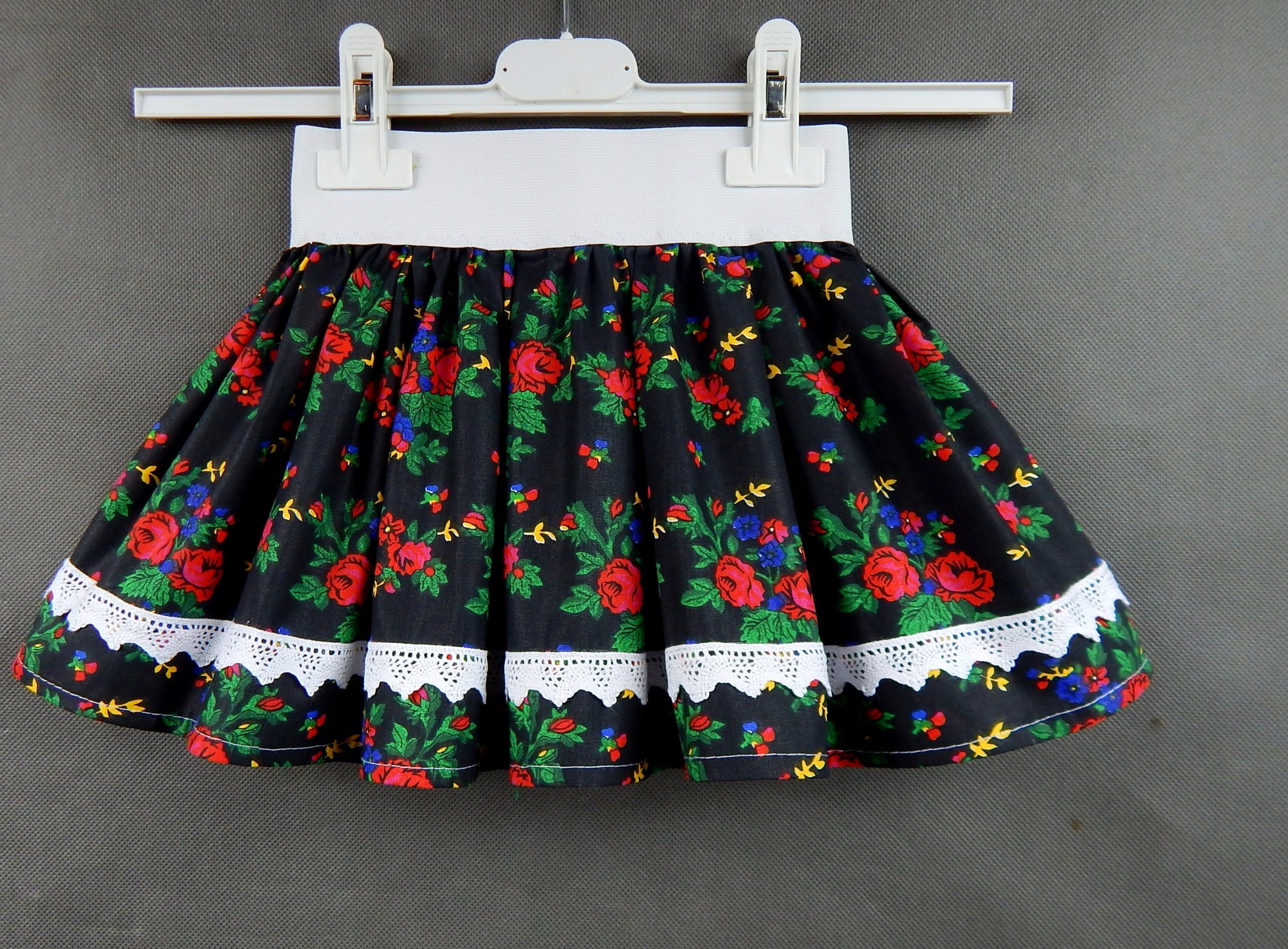 Резиночка в талии шириной 5 см, благодаря чему идеально садится по фигуре ребенка.Ткань юбки 100% хлопок, низ отделан кружевом - тоже хлопок.