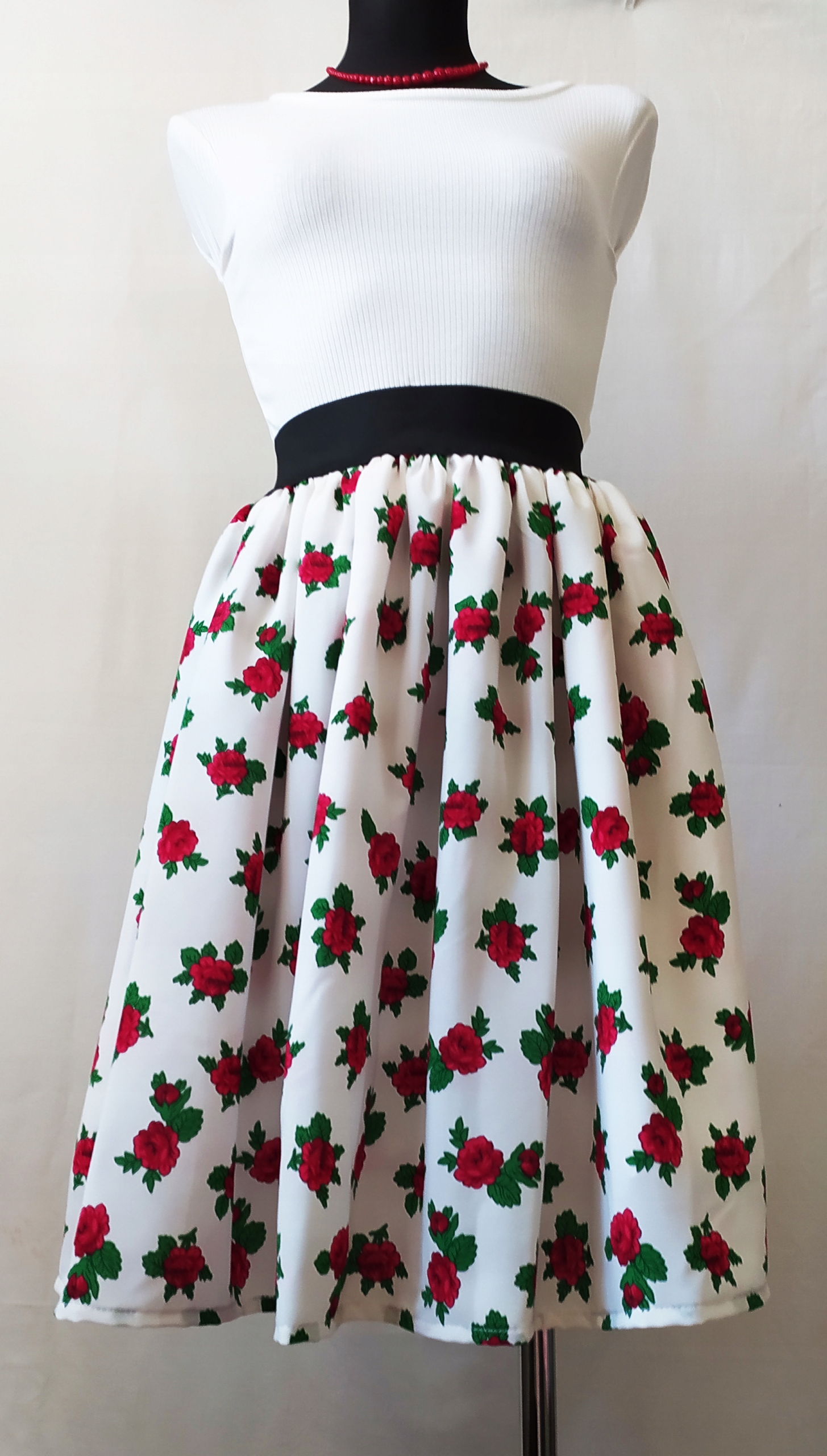 Необычная юбка на эластичном поясе из ткани, украшенной характерным узором из красных роз на белом фоне. Со складками на талии, прекрасно сидит и придает объем - идеально подходит для стиля пин-ап, ретро или романтического стиля.