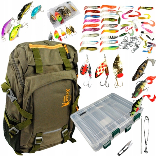 Состоит из рыболовного рюкзака, двухсторонней коробки, набора необходимых для спиннинга аксессуаров и МНОГО приманок (до 55 штук!)