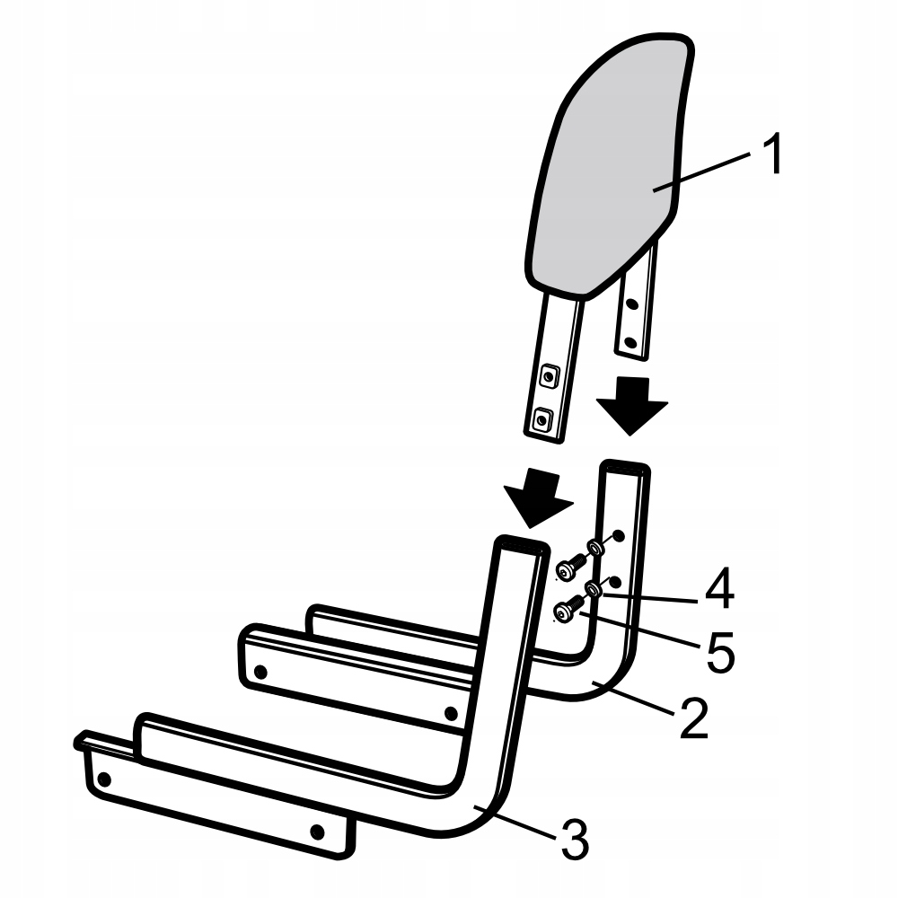 Смонтируйте спинку (1) на правую (2) и левую боковые опоры (3) с помощью шайб (4) и винтов (5).