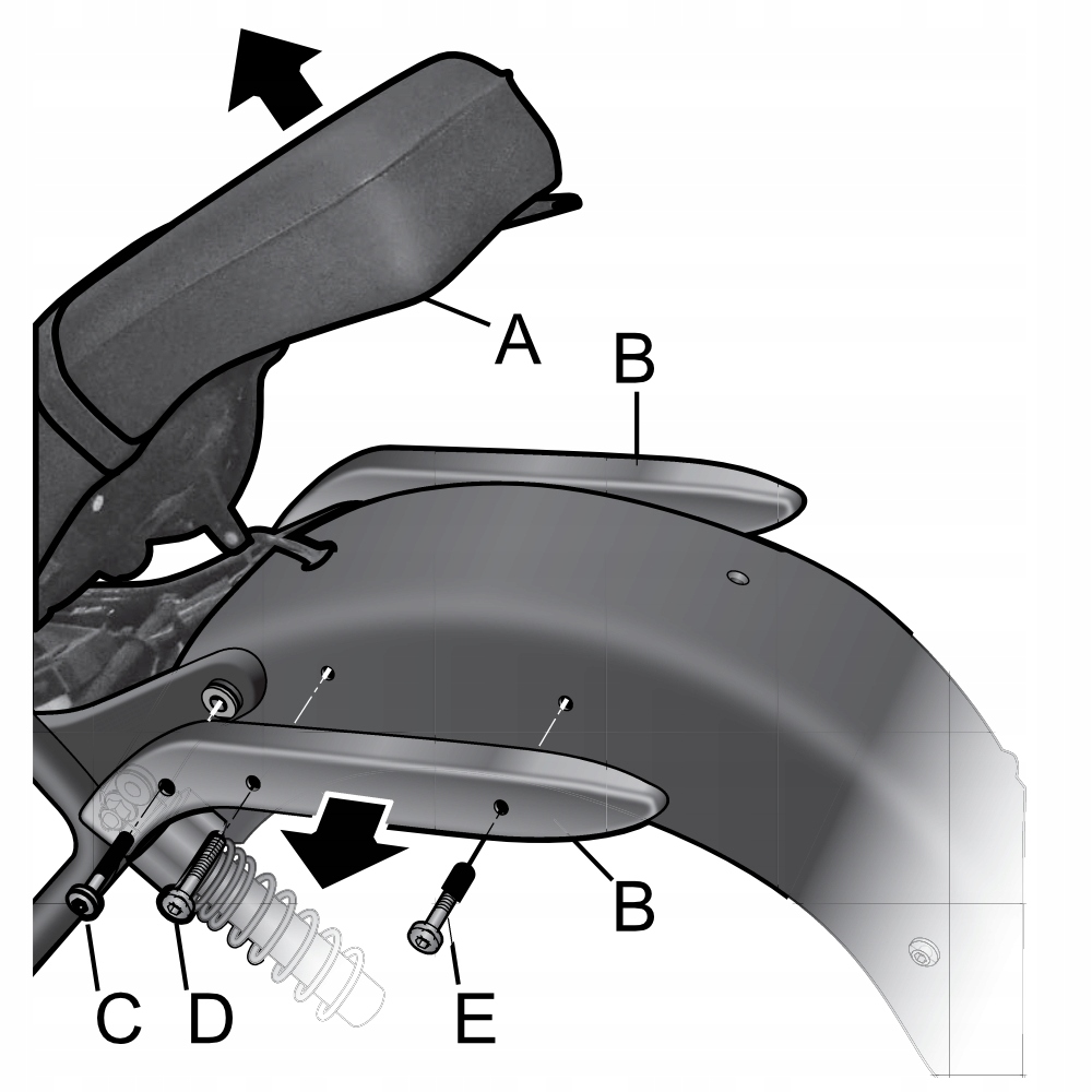 Снимите сиденье (А). Снимите крышки крыльев (B), используя передние винты (C), центральные гайки (D) и задние гайки (E).