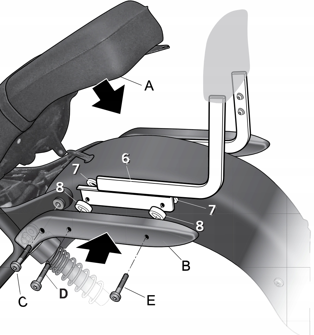 Соберите комплект (6), как показано на обзорном чертеже, между крышкой (B) и подрамником, используя винты (C). За шайбами (7) расположены проставки (8) и винт (D), а также с шайбами (7) — проставки (8) и винт (Е). Установите сиденье (А).