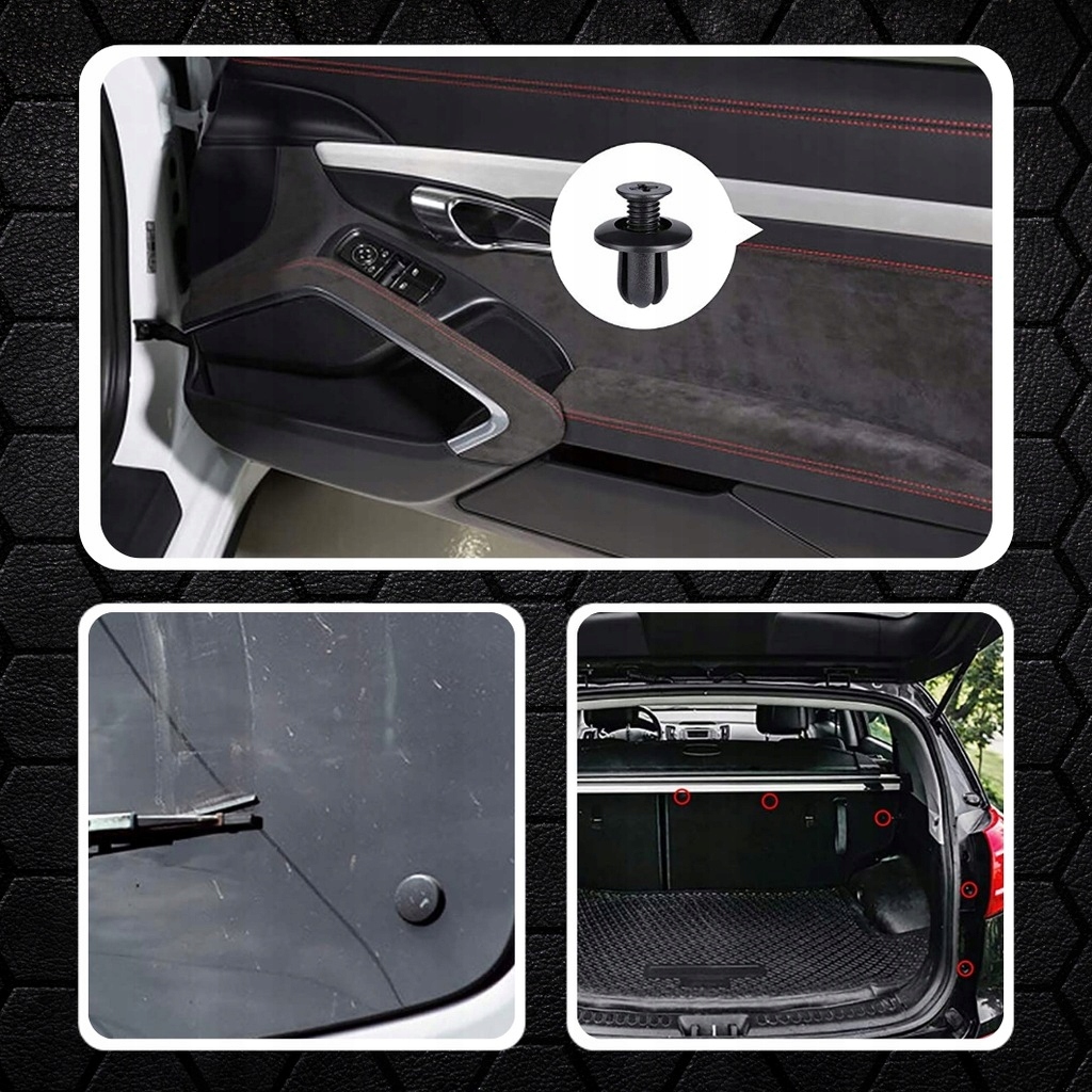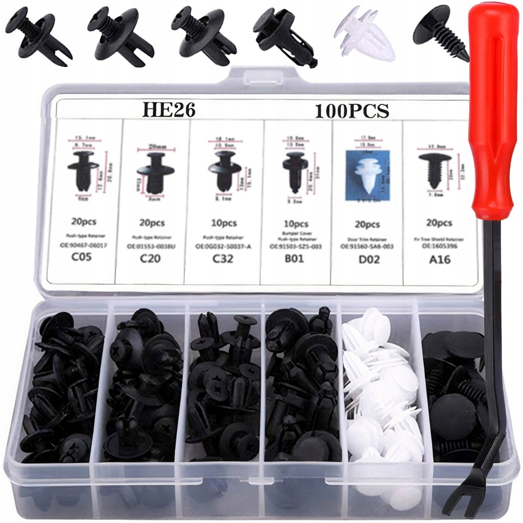 Набор, состоящий из различных типов элементов, таких как штыри, штыри, зажимы и защелки, предназначенных для крепления различных деталей в автомобилях, например обивки, пластиковых элементов , бамперы и уплотнители, доступны в универсальных размерах, которые обычно используются в большинстве марок автомобилей.