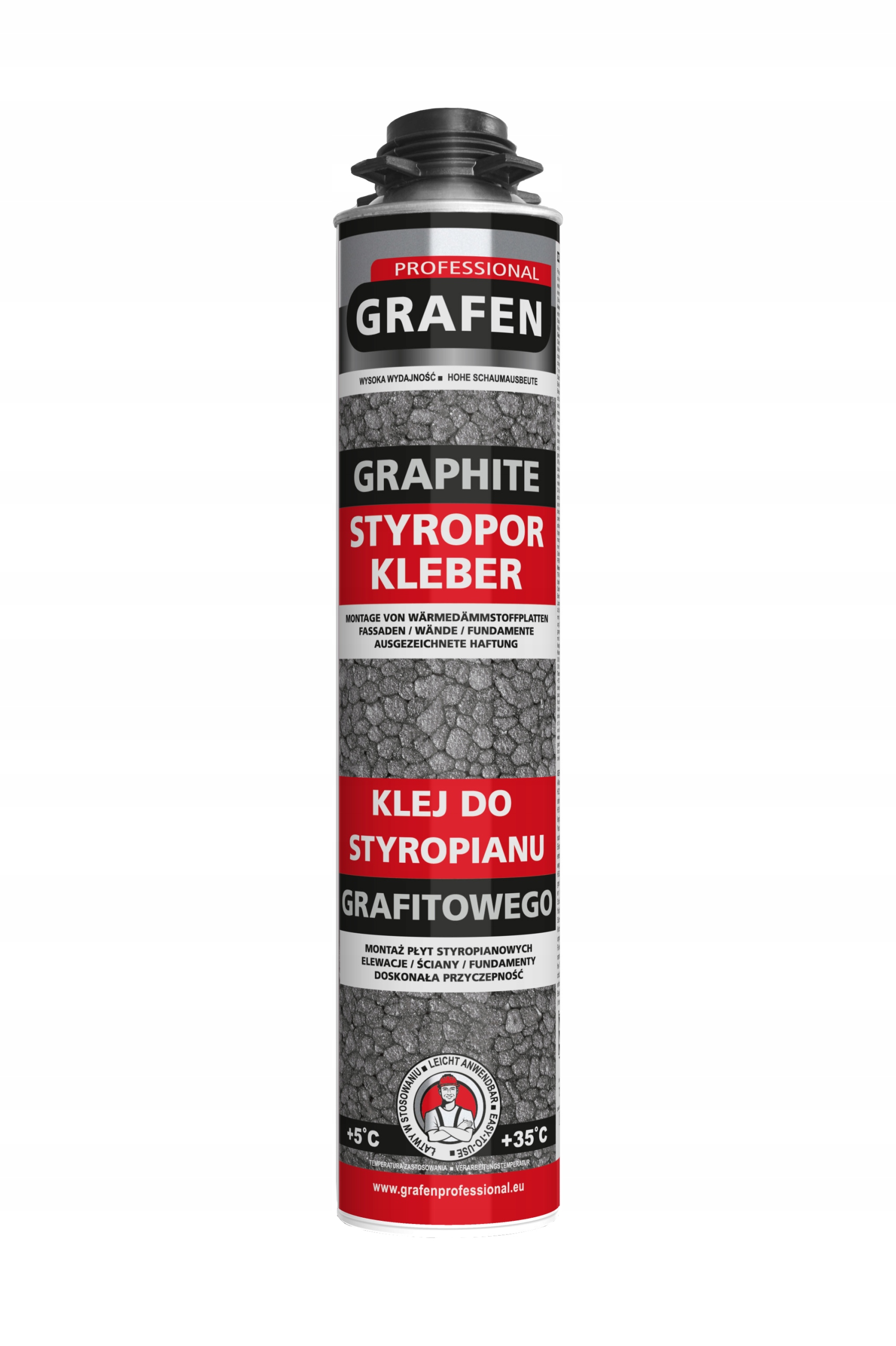Все поверхности должны быть ровными, чистыми, очищенными от жира и рыхлых загрязнений (пыль, комки раствора, старый герметики и др.). Не используйте во время дождя и сильного ветра. Увлажните основание непосредственно перед нанесением клея. Защитите столярные элементы и изделия из листового металла от возможного загрязнения. Содержимое банки тщательно перемешайте энергичным встряхиванием (30 раз). Банка должна быть комнатной температуры (при необходимости погрузить банку в теплую воду). Прикрутите баллон к пистолету и отрегулируйте насадку. Держите выходное отверстие пистолета на расстоянии 2 см от поверхности. Нанесите клеевую дорожку диаметром 3 см непосредственно на поверхность пенопластовой плиты по всему периметру плиты, примерно на расстоянии 5 см от края, и в центральной части зигзагом W-образной формы. Примерно через 2-4 минуты. прижмите панель к стене, слегка нажмите и определите ее окончательное положение в пределах макс. 15 мин. (при +20°C и относительной влажности 65%). При более высоких температурах и влажности время коррекции сокращается, при более низких температурах – увеличивается. Подождите несколько минут, прежде чем прикреплять панели к стене, чтобы клей сначала расширился, и впоследствии будет легче исправить положение. Этим же клеем залейте отверстия и стыки между панелями (при затвердевании он вспенивается и заполняет пустые места). Тип и количество механических соединителей определяются техническим расчетом изоляции здания. Излишки клея после затвердевания удалить механическим способом, свежие загрязнения – Графен Профессионал пенной чистящей жидкостью. Очистите пистолет и шланг с помощью GRAFEN PROFESSIONAL FOAM CLEANER.