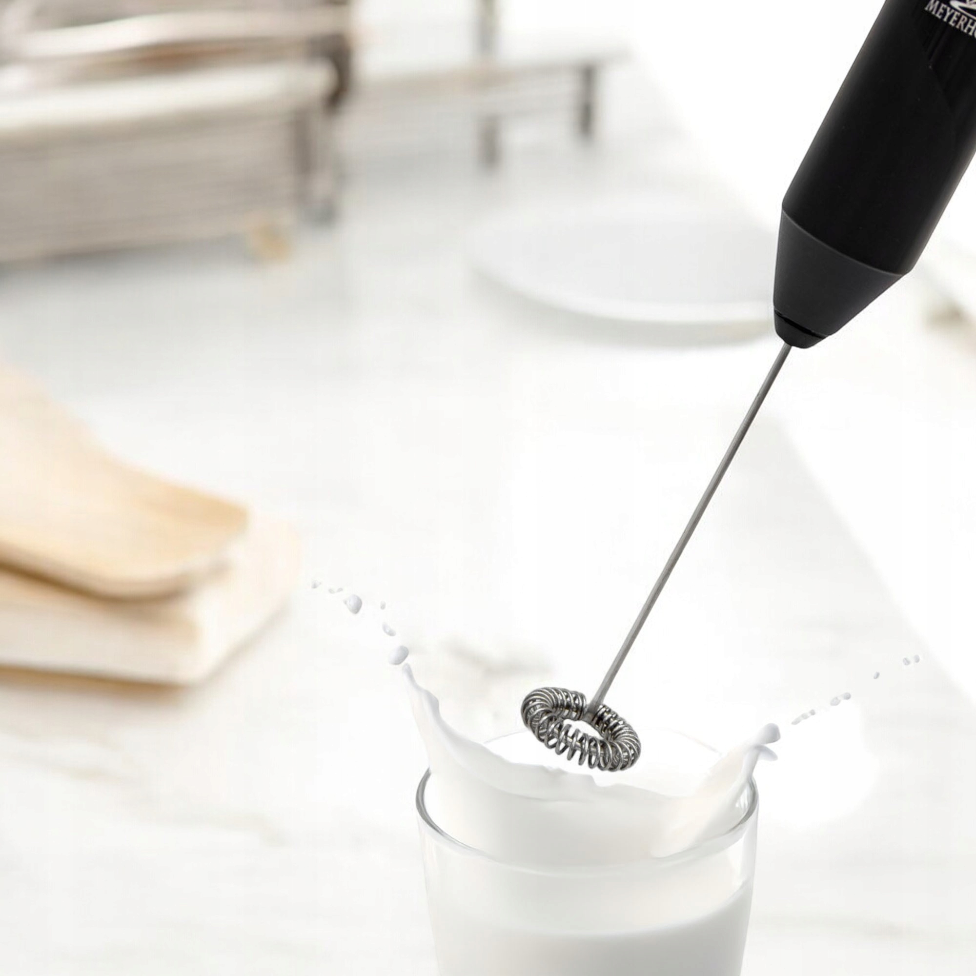Вспениватель молока Meyerhoff изготовлен из высококачественного пластика и металла и пригодится на каждой кухне. Венчик предназначен для контакта с пищевыми продуктами и безопасен для здоровья. Эргономичная и удобная ручка оснащена кнопкой, запускающей тампер. Мы можем использовать его для взбивания яиц, сливок или молока для кофе со льдом. Это очень практичный инструмент, работающий от батареек типа АА (2 шт.).