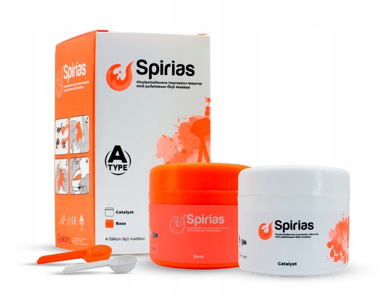 Spirias- это давление на основе высокого гидрофильного поливинилосилоксана, заштрихованного, используемого для конкретных отпечатков. Силиконовая спириас. Поставка типа доступна в различных вязкости, чтобы дать стоматологам загружать подробные и точные впечатления и выбирать правильный материал/техника.