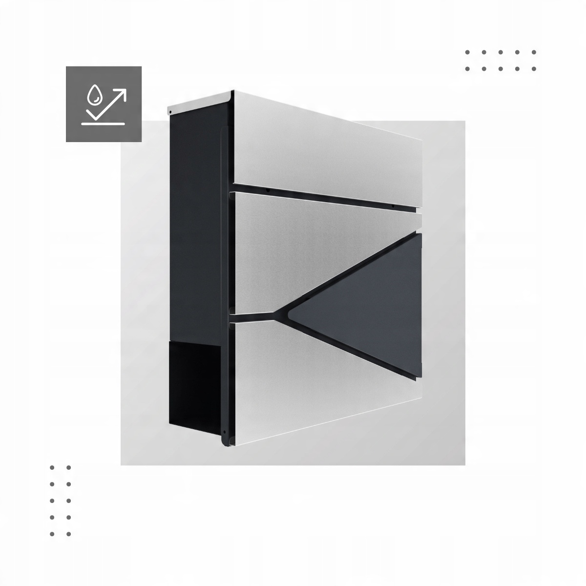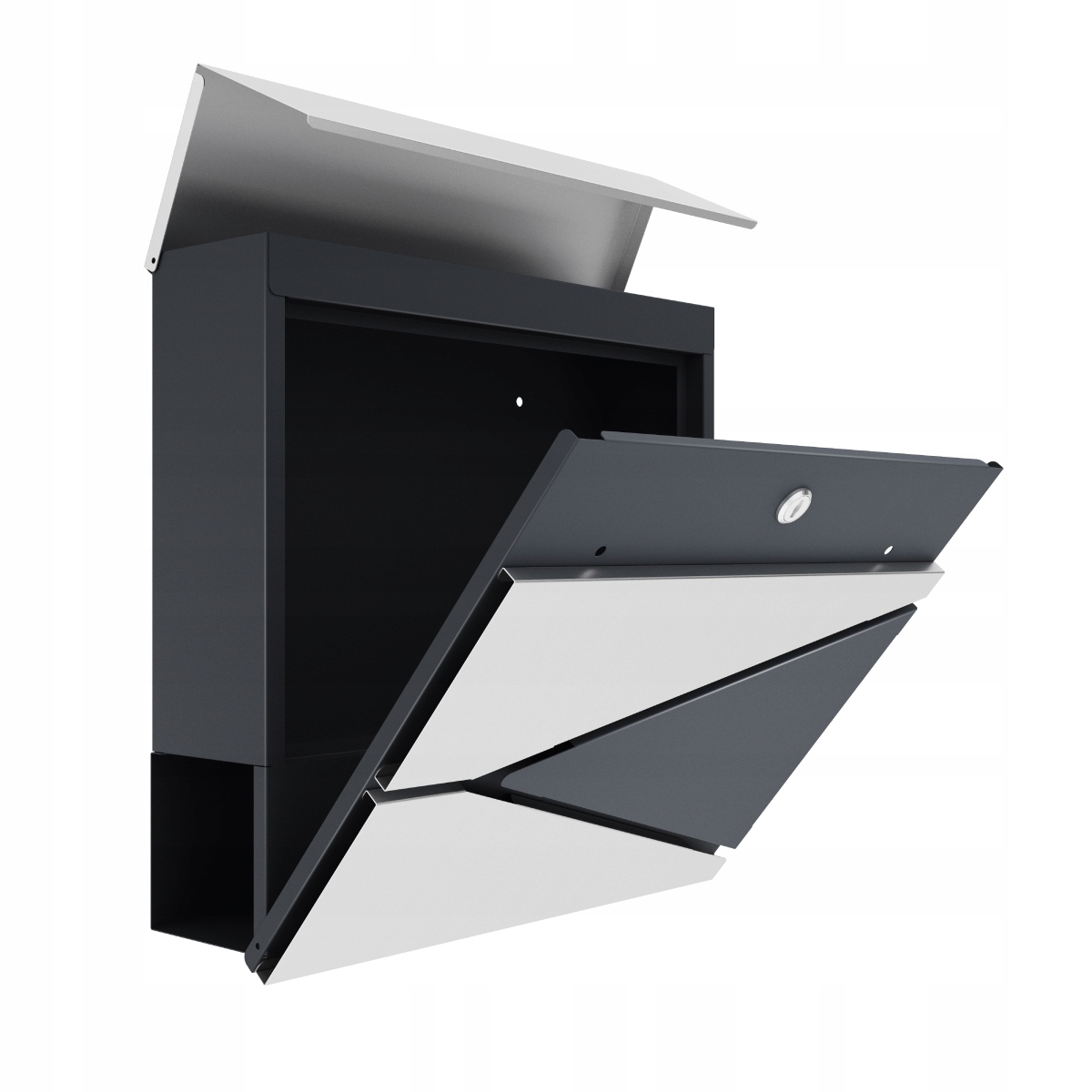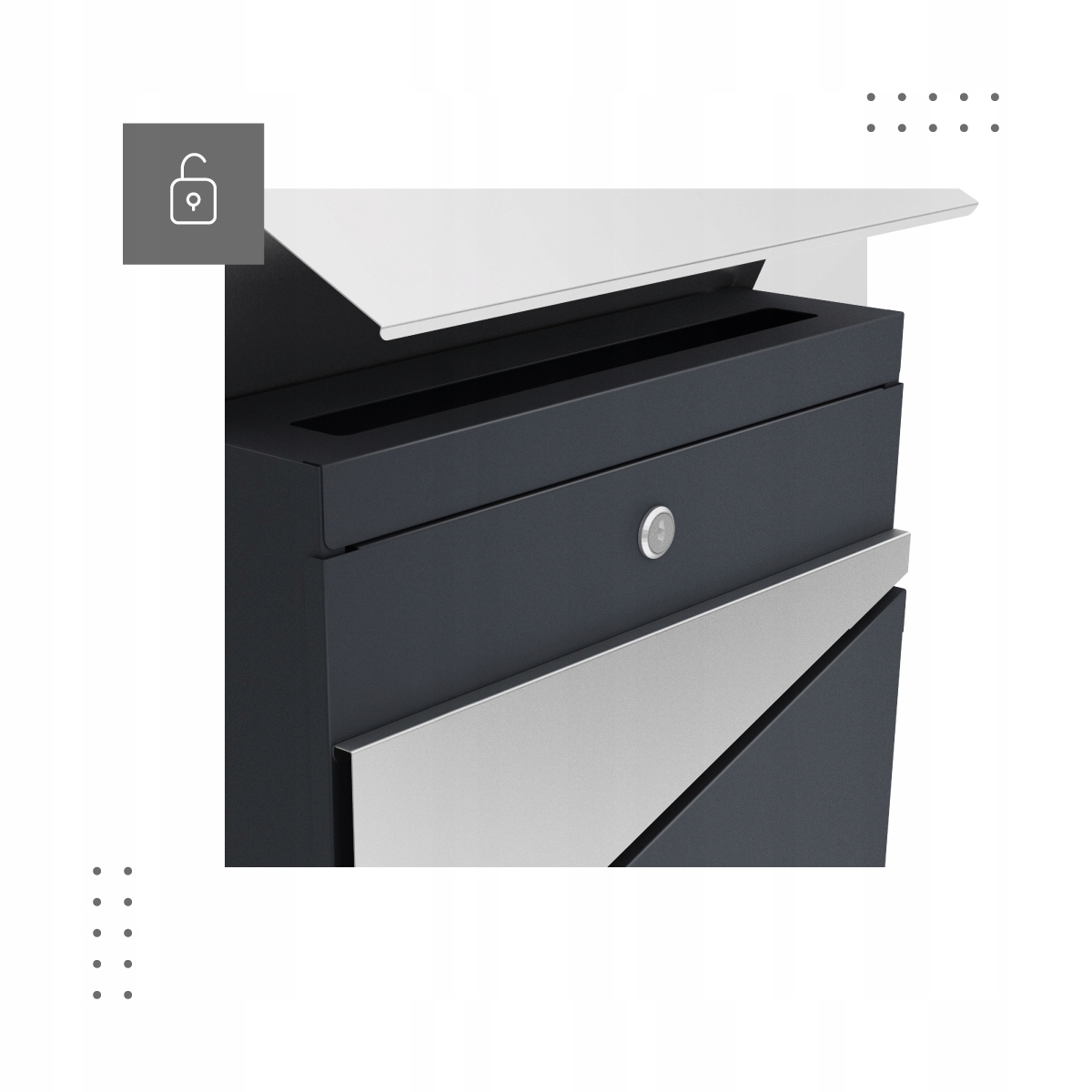 Современный дизайн коробки скрывает интересные решения - замок скрыт под верхней обложкой, благодаря которого он не замечает. В то же время он легко доступен для владельцев коробки. Переписка также скрыта под обложкой, которая защищает буквы от внешних факторов. Первая передняя часть коробки открывается полностью, благодаря тому, что доступ к переписке очень удобен. Вы можете легко удалить конверт в размере A4.