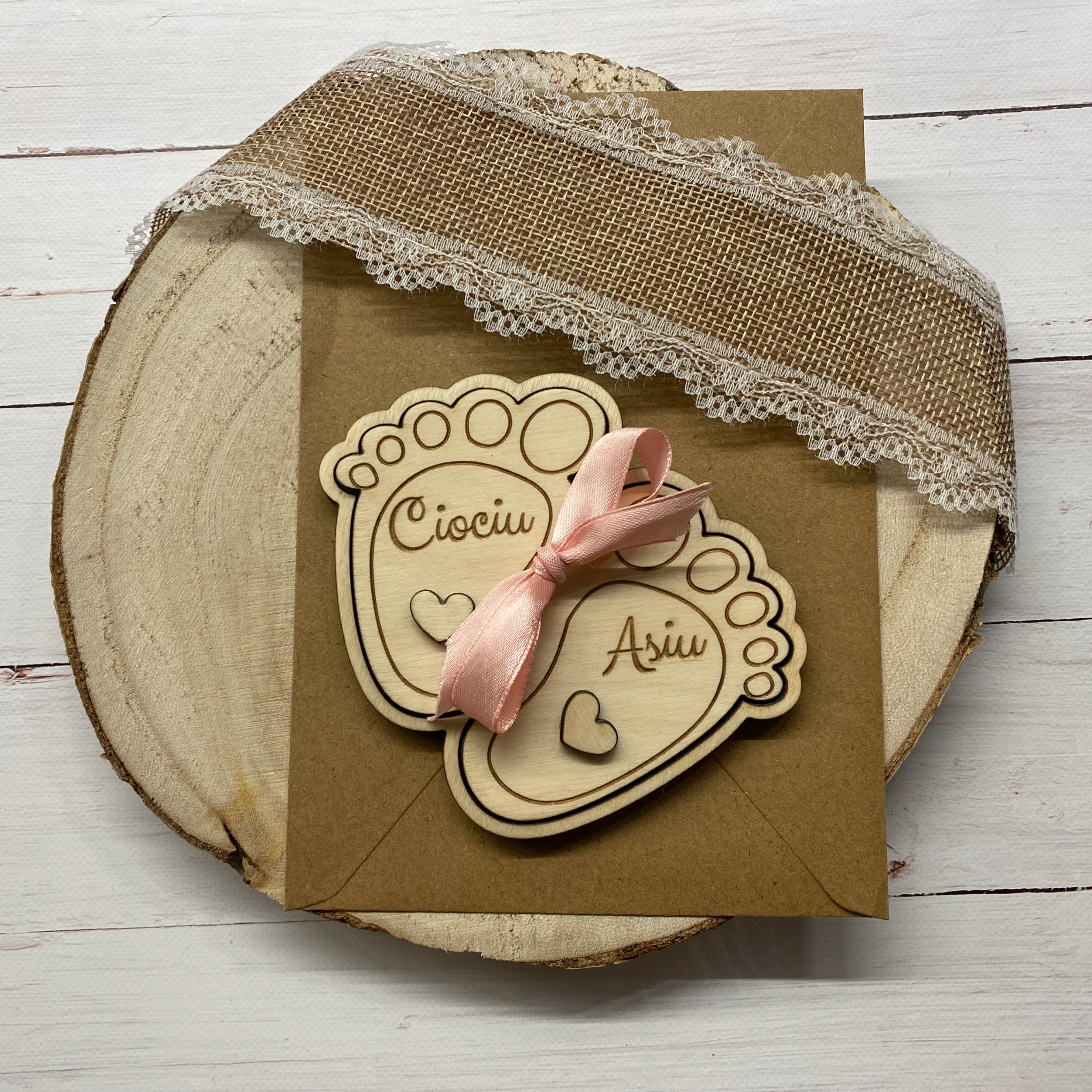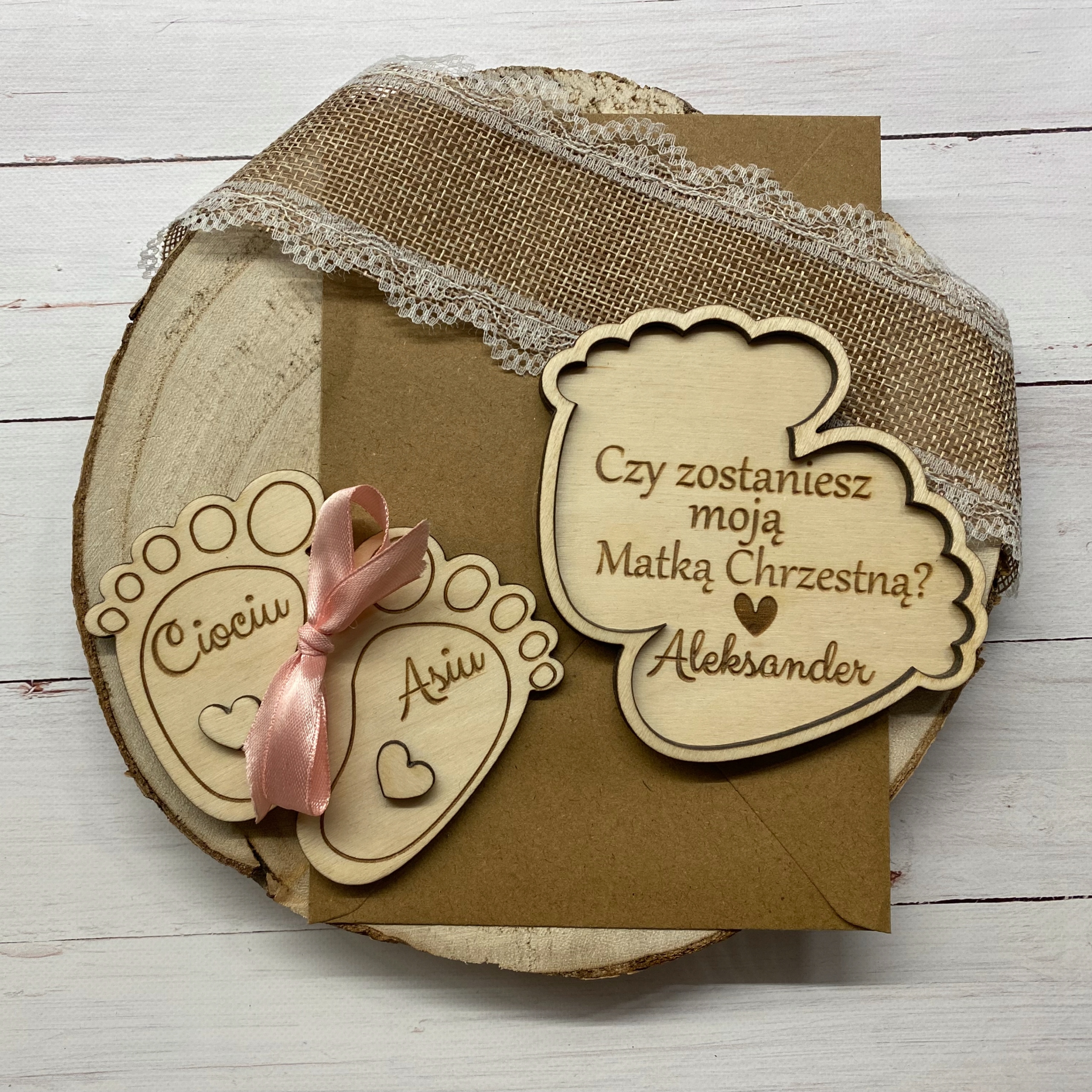 - 1x Деревянная пригласительная открытка (Основа в форме стопы, ок. 10 х 10 см + съемная ножка меньшего размера с именем тети)