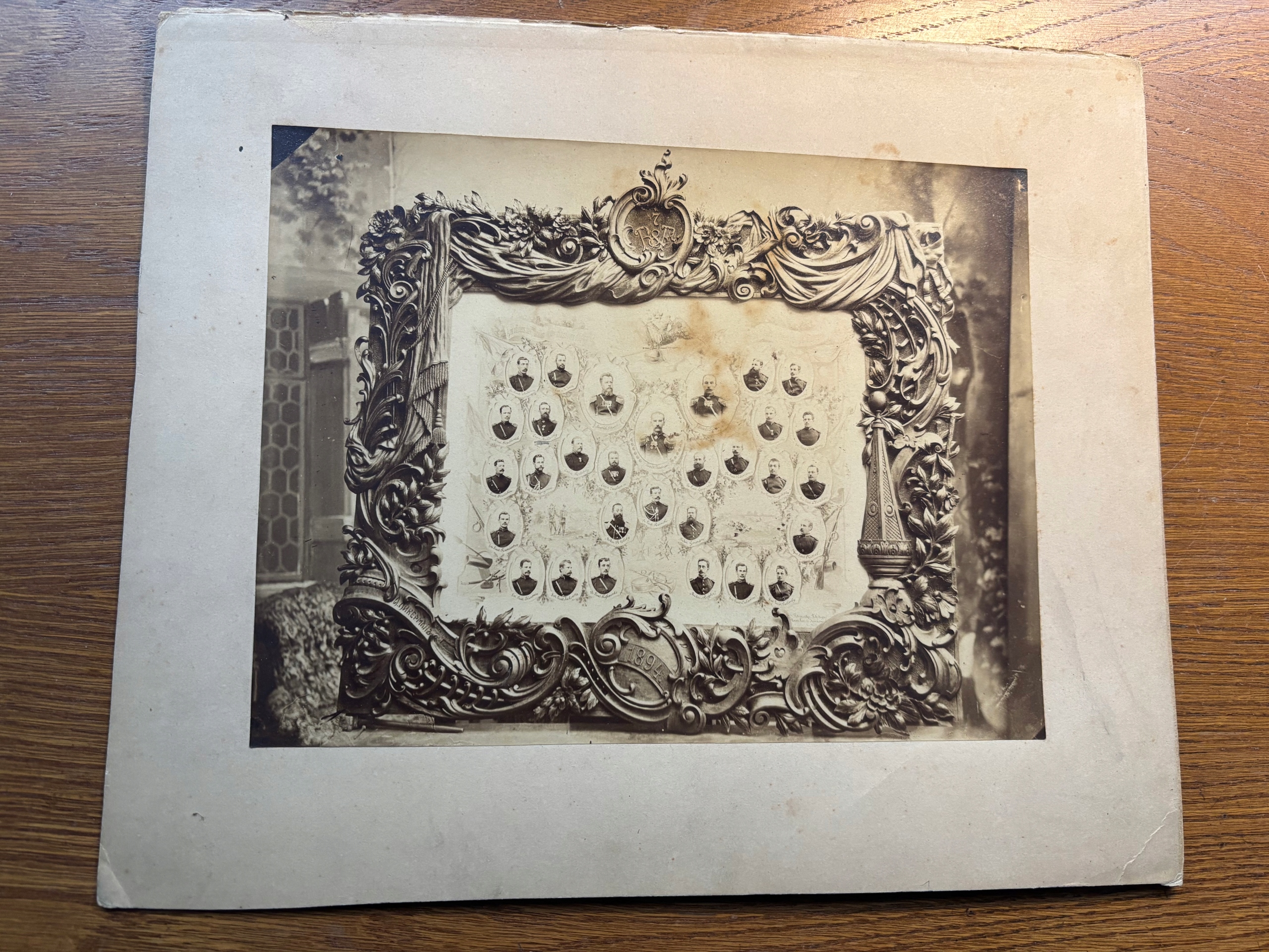 Фотография эпохи на коробке персонала офицеров Таблица 7 -го стрелкового полка 1894 года. Размеры фотографий 23x18см, картон 30x26см; Кроме того, реконструировано на фотозаводной установке с 1893 года. Размеры 47x38см. Оригинал был в плохом состоянии- у меня его нет. ; Кроме того, две фотографии на картонных боксерах офицеров полка. Размеры 16x11 см и 10x 6 см. Фотографии, сделанные на фотоэлектрических фабриках в Чисточове Уолленберге и Бромирски. Большая фотография представлена Яном Пономаревски и датирована 19.09.1900