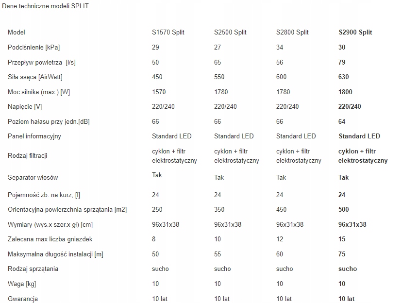 Центральные блоки S2900 Split оснащены одним двигателем с диаметром ротора 5,7" или 7,2" соответственно. Пылесосы, предназначенные для домашнего использования, конструкция которых заимствована из решений, встречающихся в промышленных сооружениях. Эти пылесосы способны убирать дома общей площадью 300 м2 и 500 м2 соответственно. Двигатели ЦП типа S1570 можно подключать параллельно с одним сепаратором DC1240 для увеличения потока воздуха. Это решение обеспечивает очень высокую производительность системы по привлекательной цене.