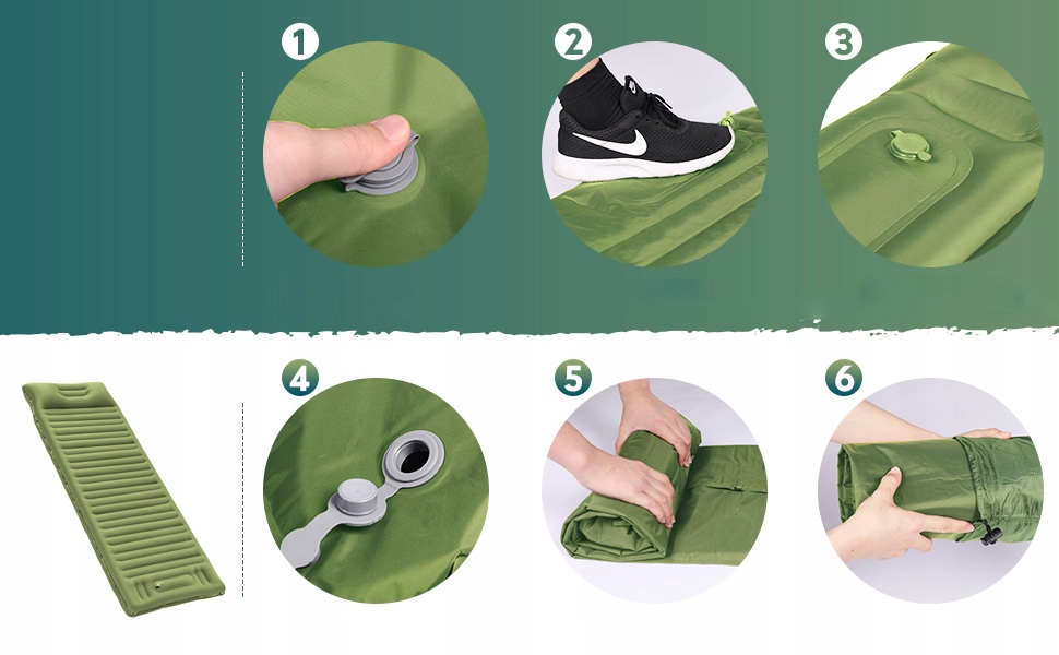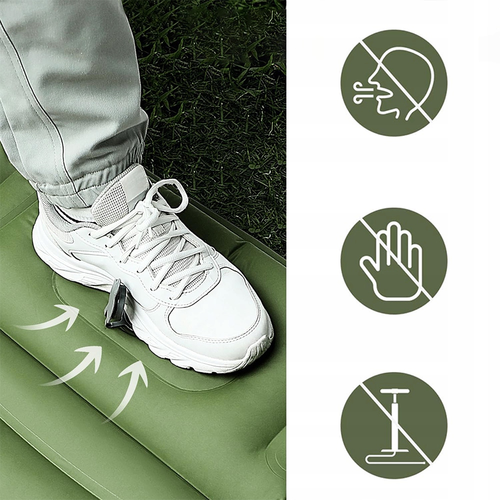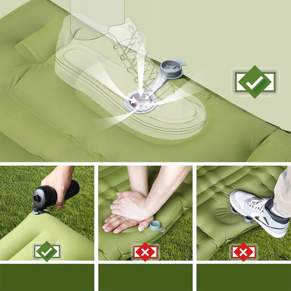 ✅ Построенный в ногах насоса: самостоятельный спальный коврик имеет встроенный насос в ногах. Вы можете полностью надуть спальный коврик в течение 1-2 минут, ударив его ногой (или рукой). Это более гигиенично, чем накачка и практичная, потому что он не требует использования дополнительного насоса.