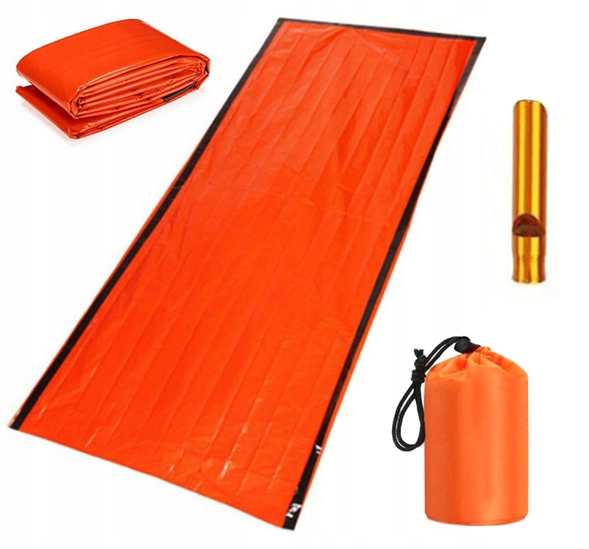 fold -out Аварийный спальный мешок из пластика. Идеальное решение, используемое в туризме, альпинизме или спасении. Используемый материал является водонепроницаемым, который совершенно изолирует от холода, ветра и трудных погодных условий. Предотвращает тело предотвращает организм в экстремальную погоду. Компактная сумка позволяет легко перемещать его, а вырез оснащен громким свистком, который позволит нам услышать на большом расстоянии.