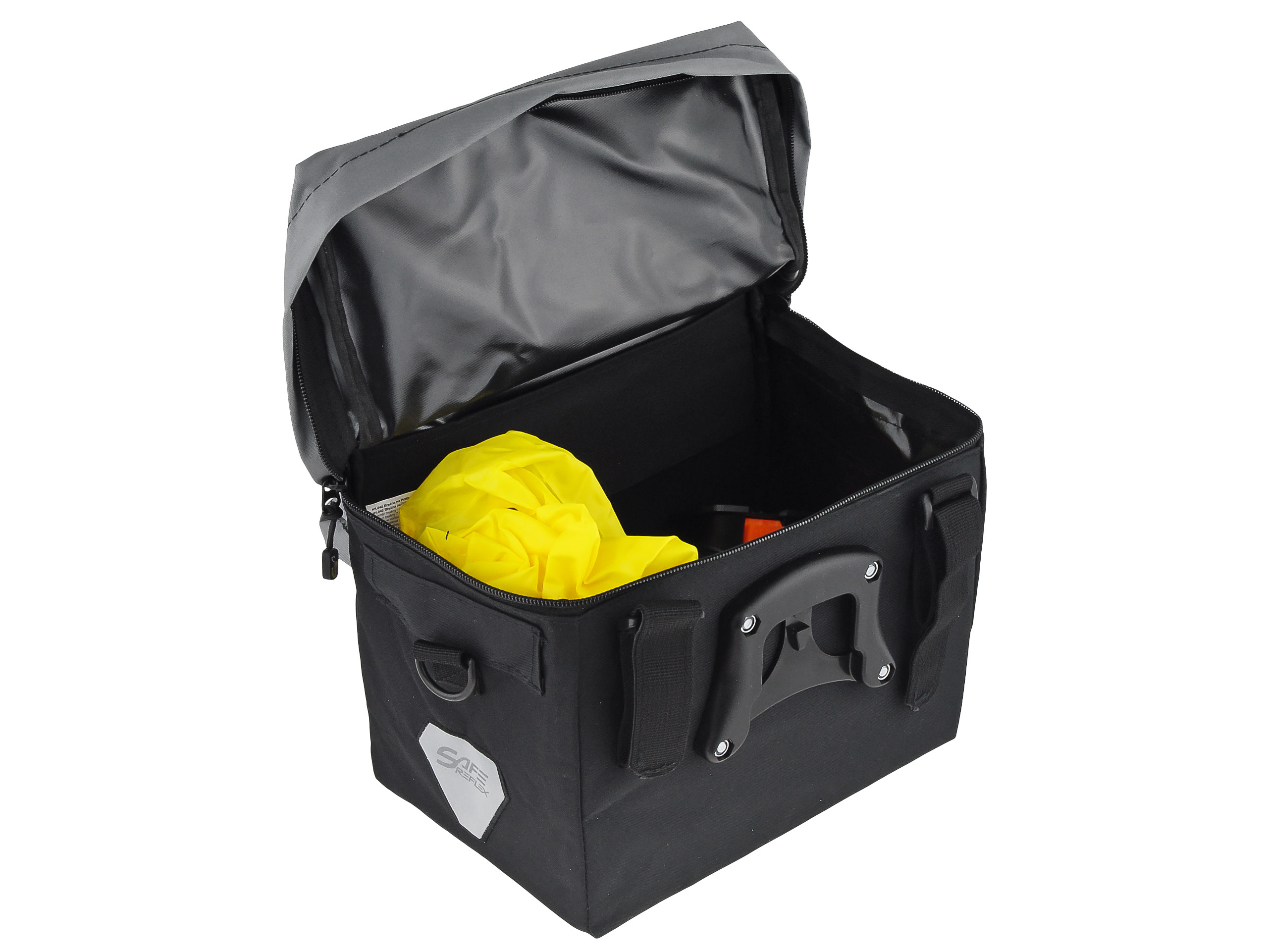 В комплект входит ручка, прикрепленная к рулю (KLICKFIX), позволяющая быстро и удобно надевать и снимать сумку. Держатель подходит для рулей диаметром 25,4 и 31,8 мм. Запирающий трос, который удерживает сумку и ручку в правильном положении на руле. Внутреннее пластическое усиление.