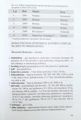 Описание: В книге показано, насколько важна физическая активность для людей после трансплантации органов и на диализе во всем мире, в Европе и Польше. Это также краткий обзор деятельности и достижений Польской ассоциации спорта после трансплантации в 2005-2010 годах, включая популяризацию сознательного донорства органов и истоки спорта после трансплантации в Польше. Издание состоит из пяти основных глав, в том числе: описывает спорт для людей после трансплантации органов и находящихся на диализе, руководство для пациентов и фотогалерею, в которой представлены медалисты соревнований среди взрослых, детей и юниоров, а также международных и отечественных мероприятий.