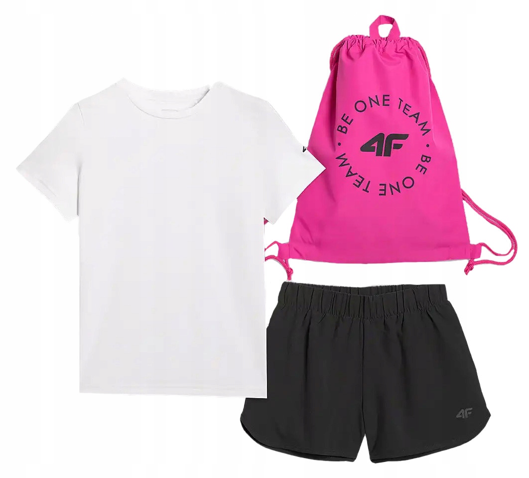Быстрый спортивный набор 4F - это готовый набор для занятий PE и других школьных мероприятий. Набор включает в себя белую -колорную мала, черные шорты и практическую розовую сумку.
