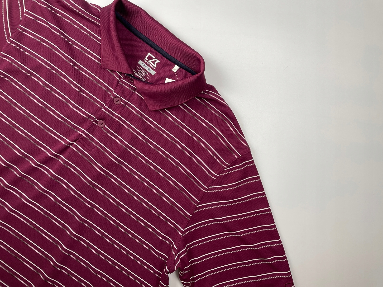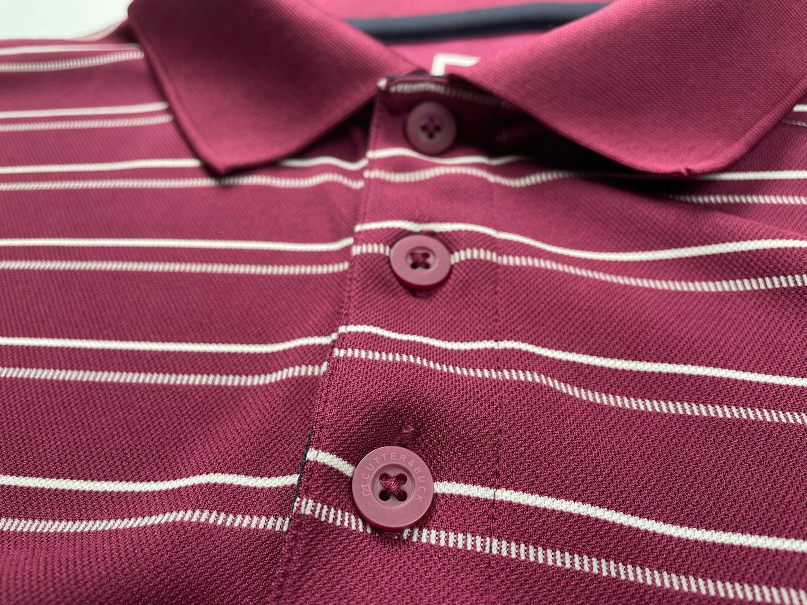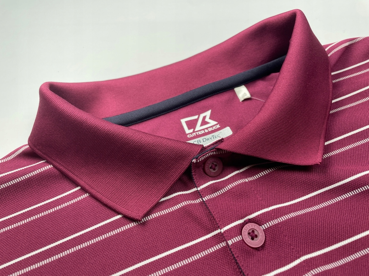 - Спортивная рубашка-поло от Cutter&Buck. Он бордового цвета с узором из белых горизонтальных полос. Футболка имеет короткие рукава и воротник, застегивающийся на фирменные пуговицы. Имеет классический простой крой. Имеет разрезы по бокам. Блузка изготовлена из материала с нежной точечной структурой. Есть запасная пуговица.