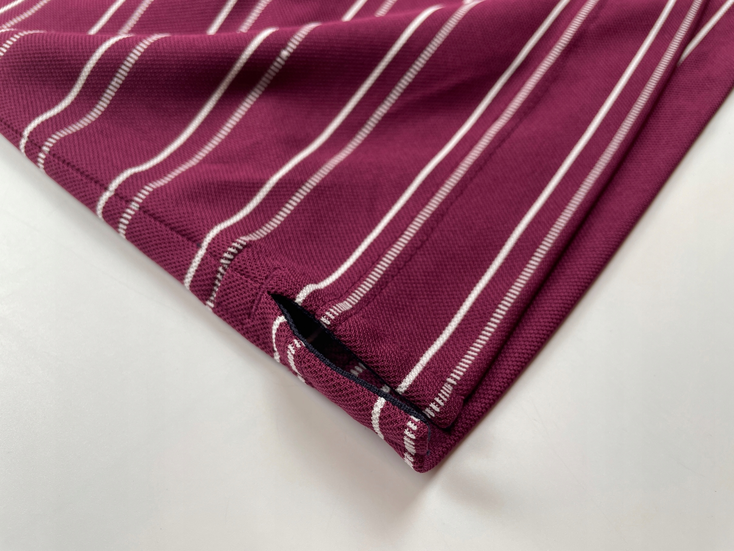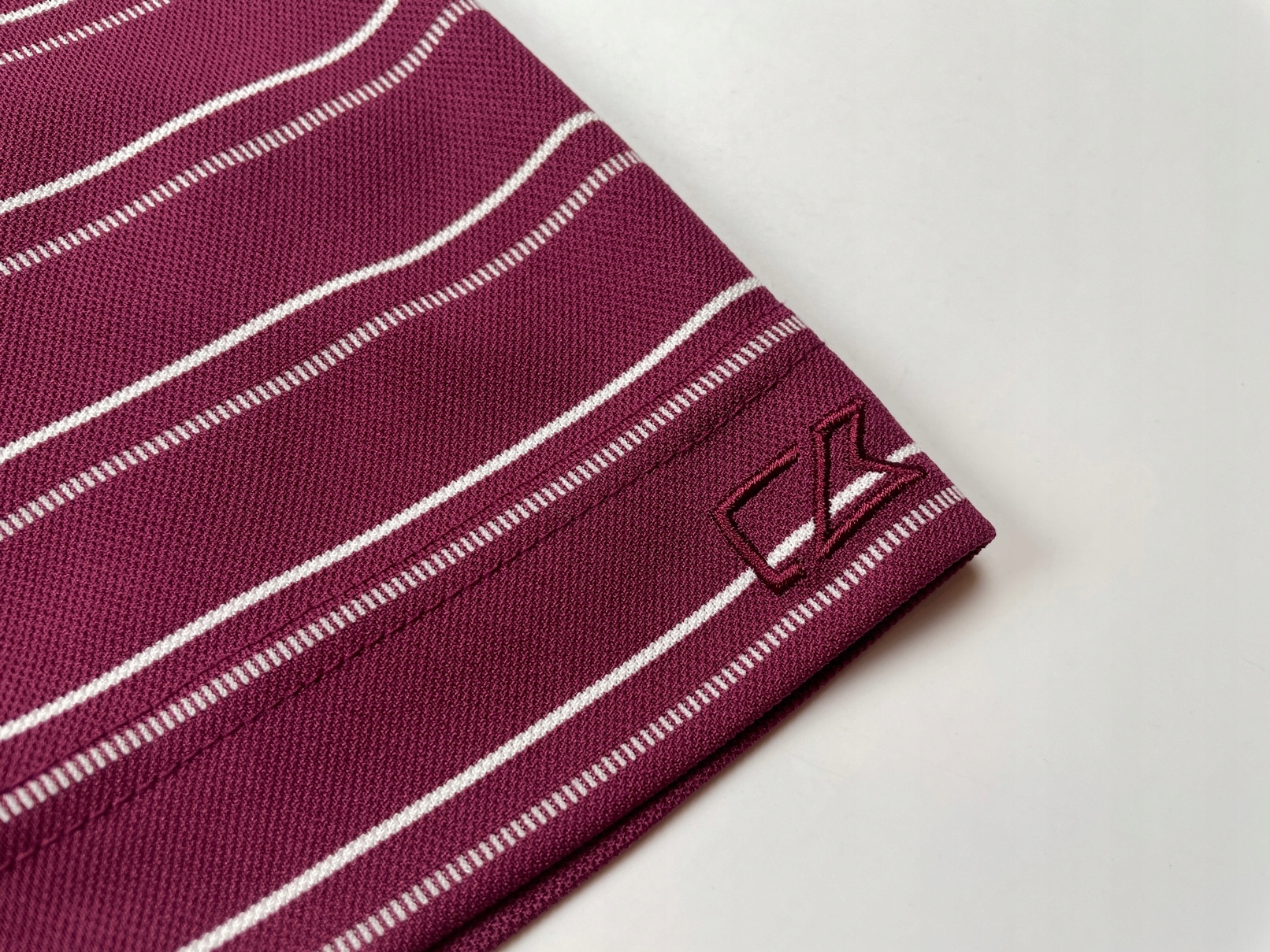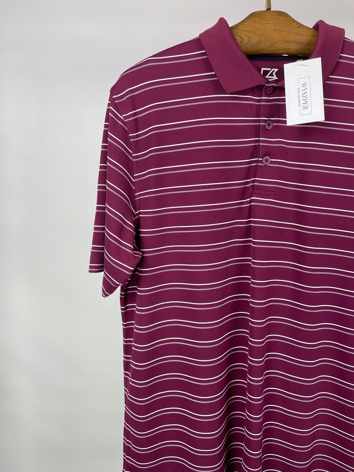 - Спортивная рубашка-поло от Cutter&Buck. Он бордового цвета с узором из белых горизонтальных полос. Футболка имеет короткие рукава и воротник, застегивающийся на фирменные пуговицы. Имеет классический простой крой. Имеет разрезы по бокам. Блузка изготовлена из материала с нежной точечной структурой. Есть запасная пуговица.