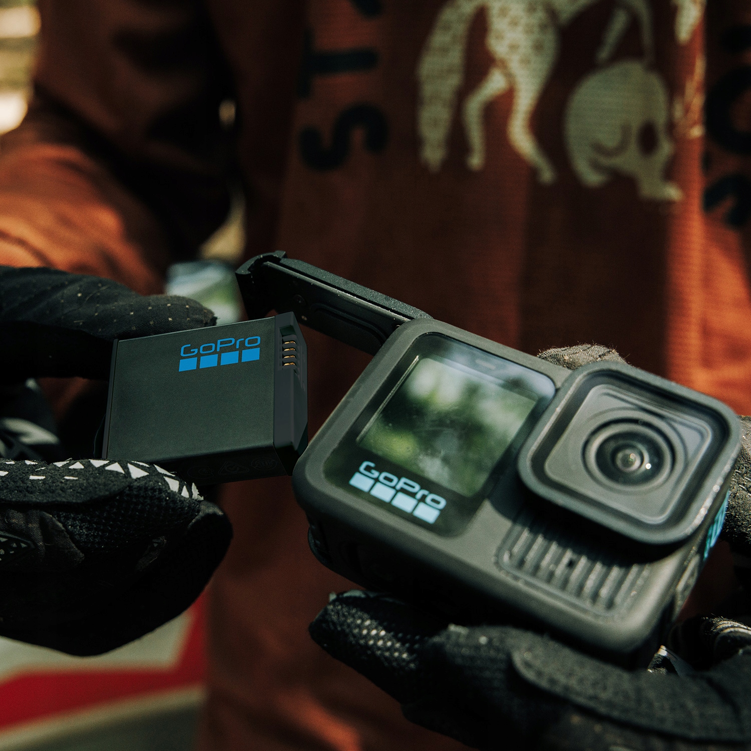 HERO13 Black имеет больше возможностей электропитания, чем все предыдущие камеры GoPro. Водонепроницаемый магнитный силовой кабель и дверной комплект Contacto (1) имеет магнитное соединение, которое позволяет быстро и легко подключиться к внешнему источнику питания. Зарядное устройство для двух аккумуляторов со встроенным аккумулятором Powerbank1 имеет собственный внутренний аккумулятор, с помощью которого вы можете удобно заряжать два прилагаемых аккумулятора Enduro где угодно. Их также можно подключить непосредственно к камере для очень длительных сеансов записи.