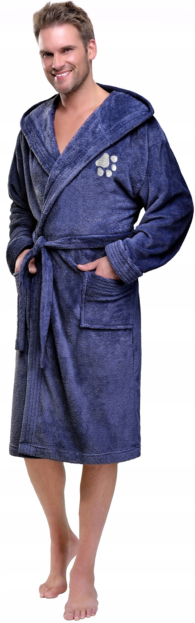 Мужской халат с капюшоном, привязанный к талии, с мягкой вязаной тканью (мягкой), на внешних карманах бедра, на высоте сундука вышивки - лапа - лапа. Хороший и приятный на ощупь, он гарантирует носить комфорт.