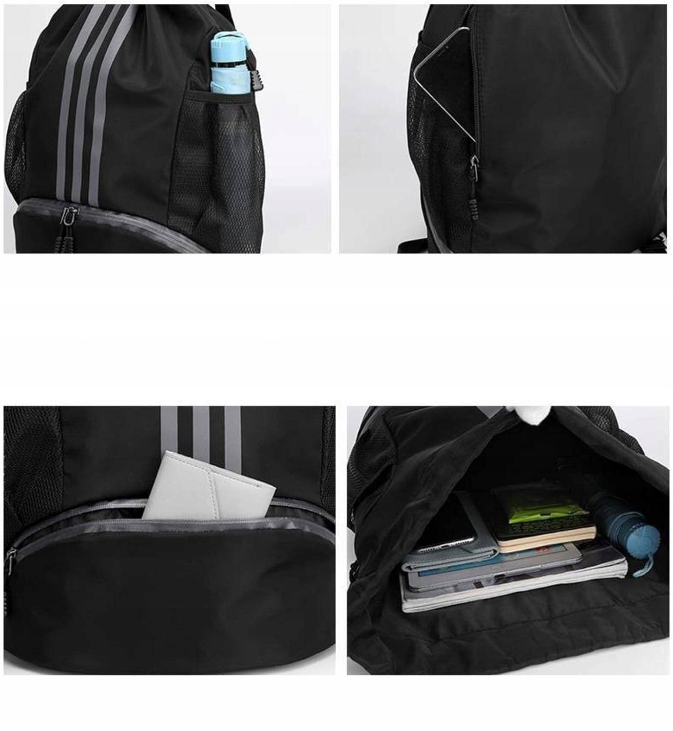 🎒 Два боковых сетчатых кармана для спортзала рюкзак может использоваться для хранения бутылок с водой и зонтиков. Передний карман для салфеток и туалетных принадлежностей. Внутренний карман на молнии предназначен для хранения мелких ценных вещей, таких как спортивные часы и кошельки. В нижнее отделение сумки-рюкзака можно положить дополнительную пару кроссовок.