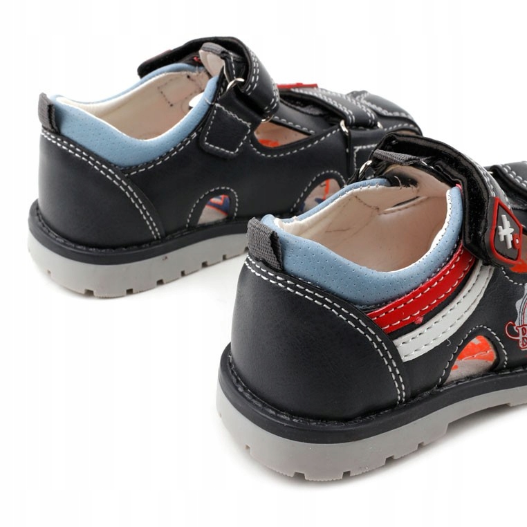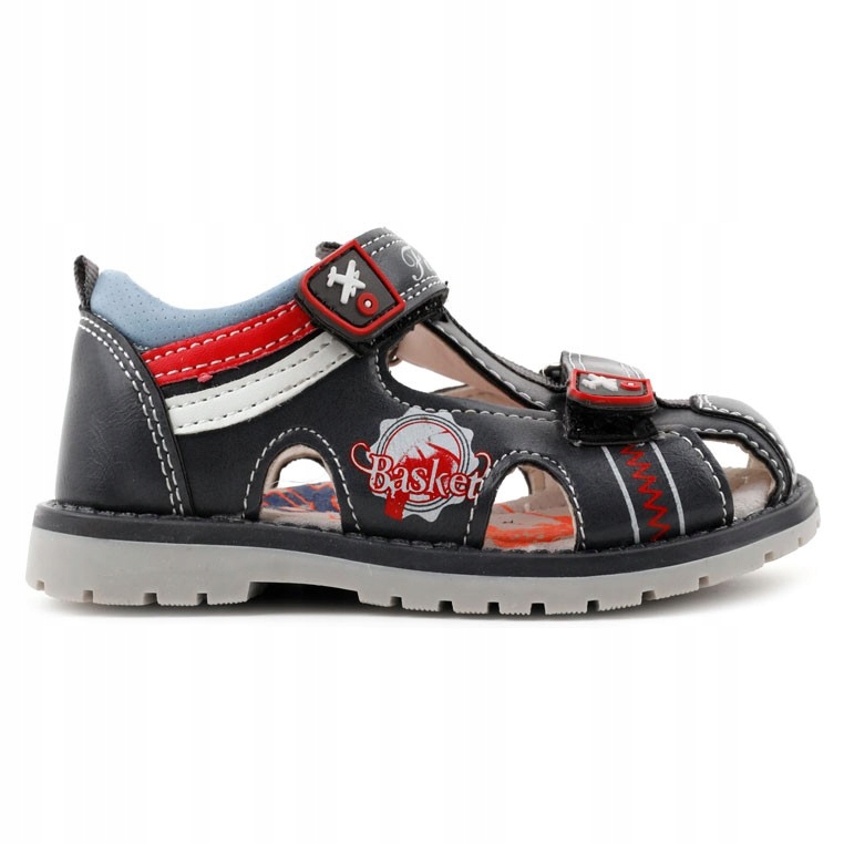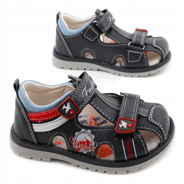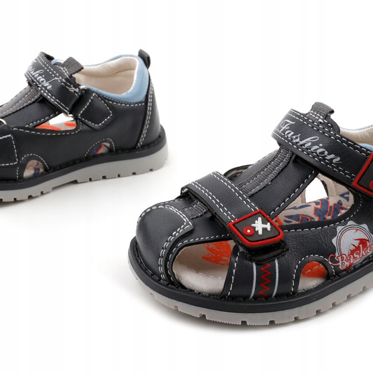 Сандалии мальчики на плоской подошве. Закреплен наверху с двумя липучками. Модель с покрытыми пальцами и покрытой, жесткой пяткой. Сделано из эко -лизера. Украшен красочными вставками, надписями. Они будут работать во время повседневных прогулок.