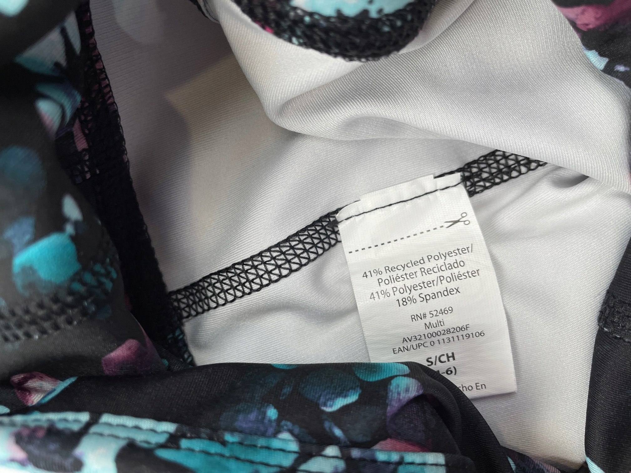 - Состав материала леггинсов составляет 41% переработанный полиэстер, 41% полиэфир и 18% спандекса.
