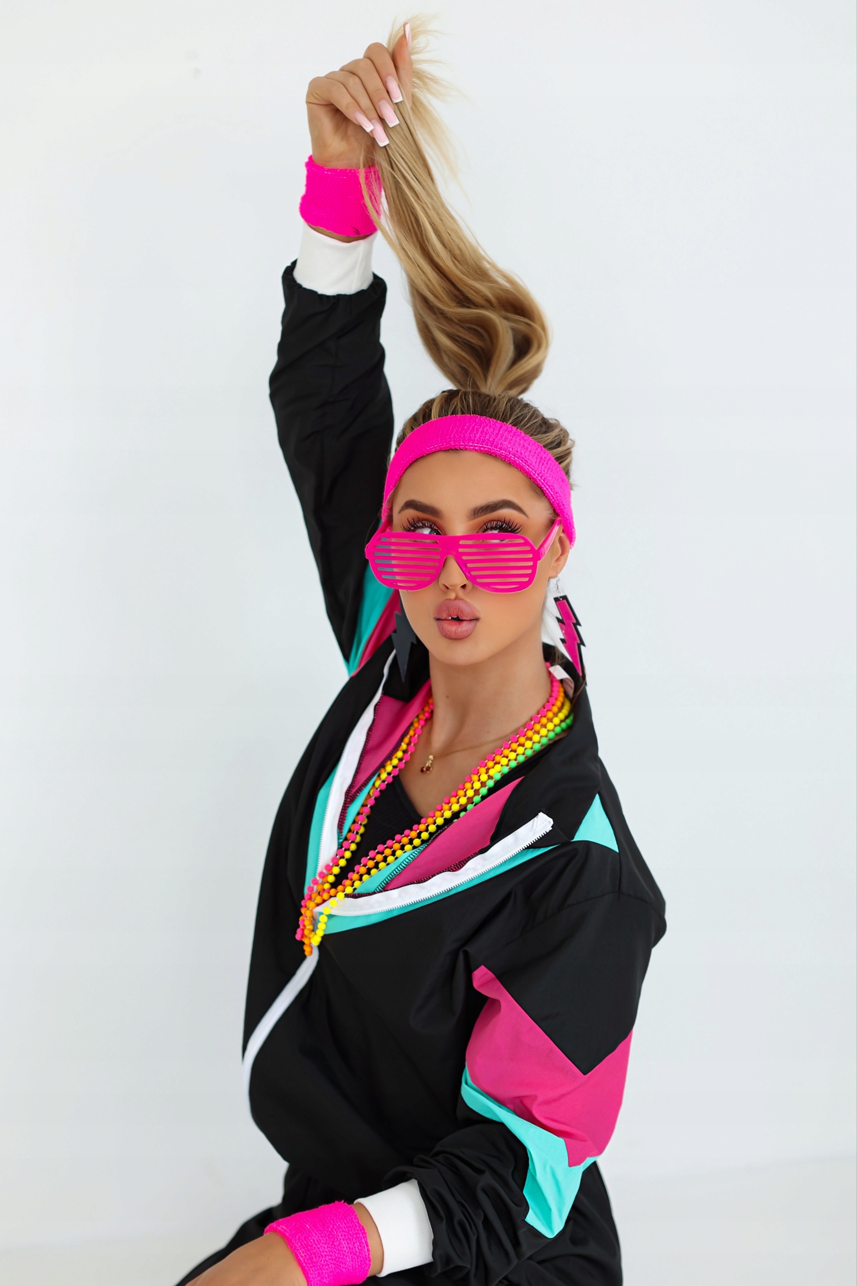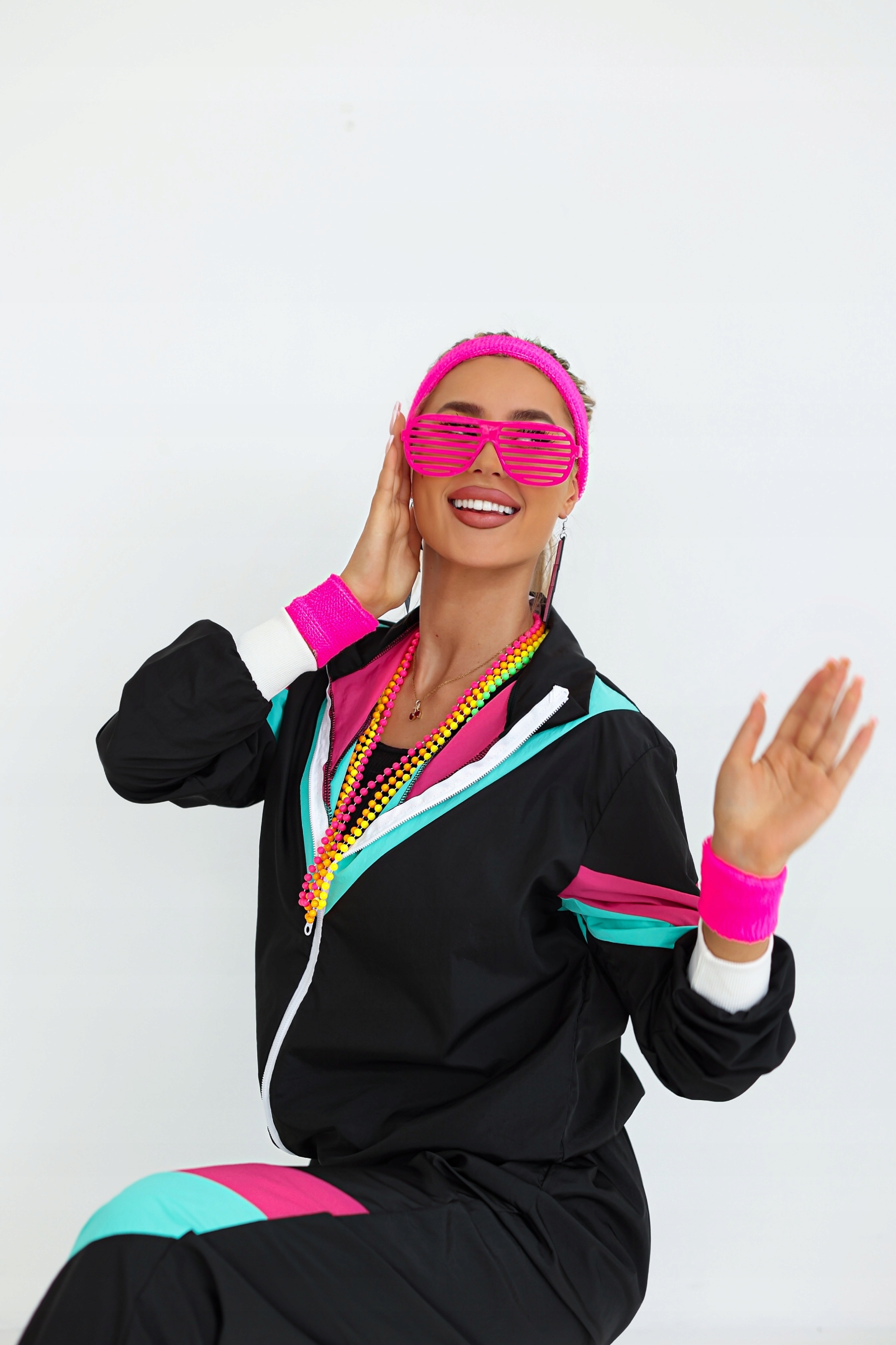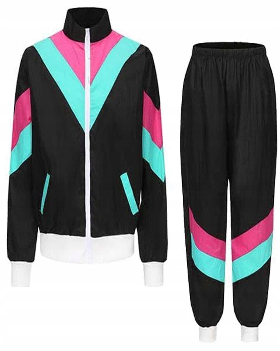 - Неоновый спортивный костюм в стиле ретро — культовое сочетание розового, бирюзового и черного цвета, которое привлечет любой образ. Удобный и стильный, идеален для танцев и отдыха.