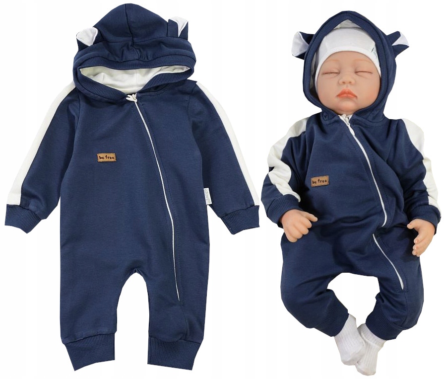 Разрез: Комбинезон с капюшоном. Застегивается по диагонали на молнию. Брюки и рукава отделаны манжетами. На капюшоне милые ушки, а на рукавах — полоски контрастного цвета.