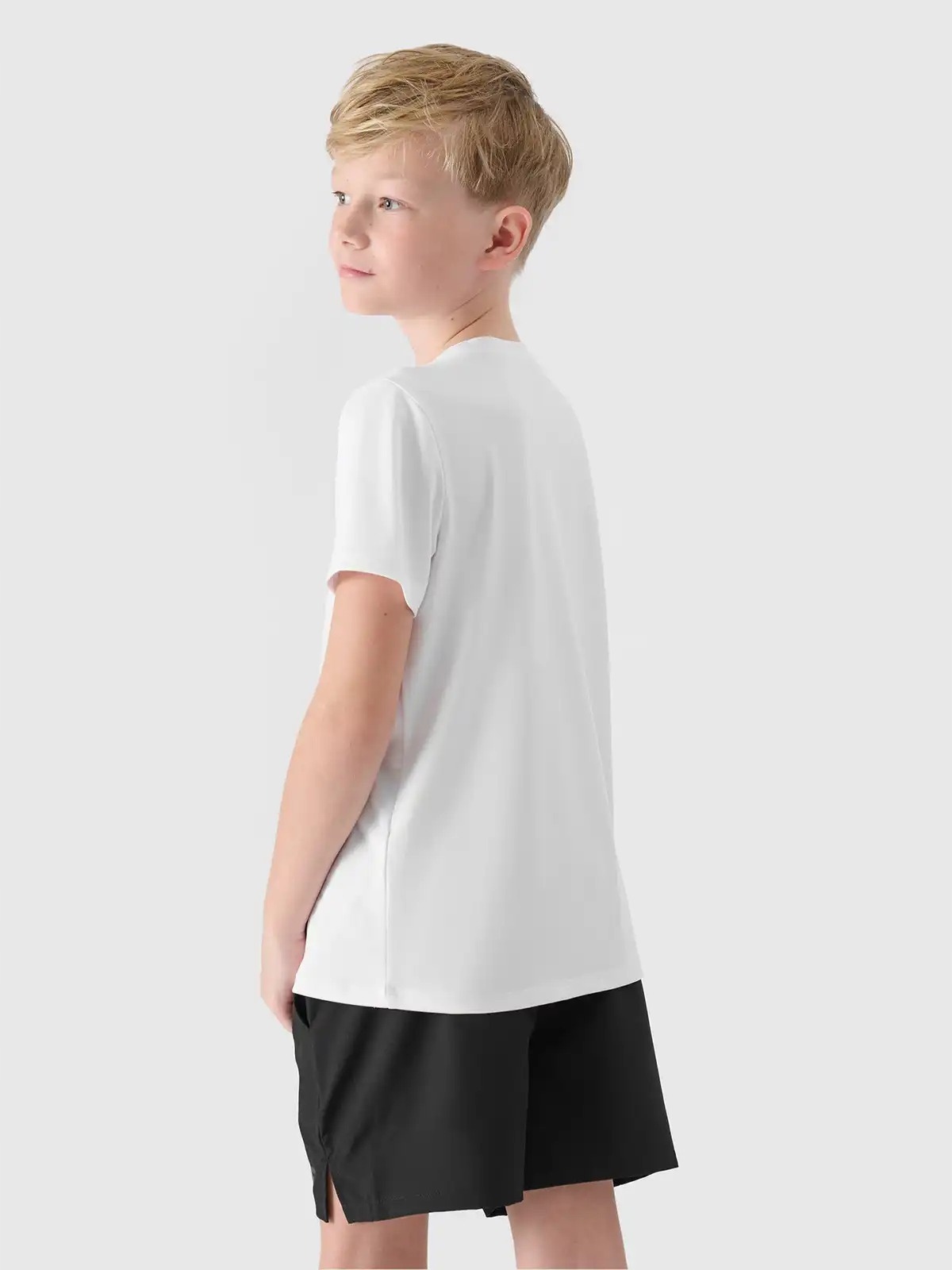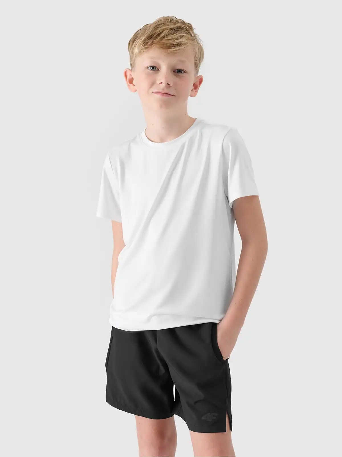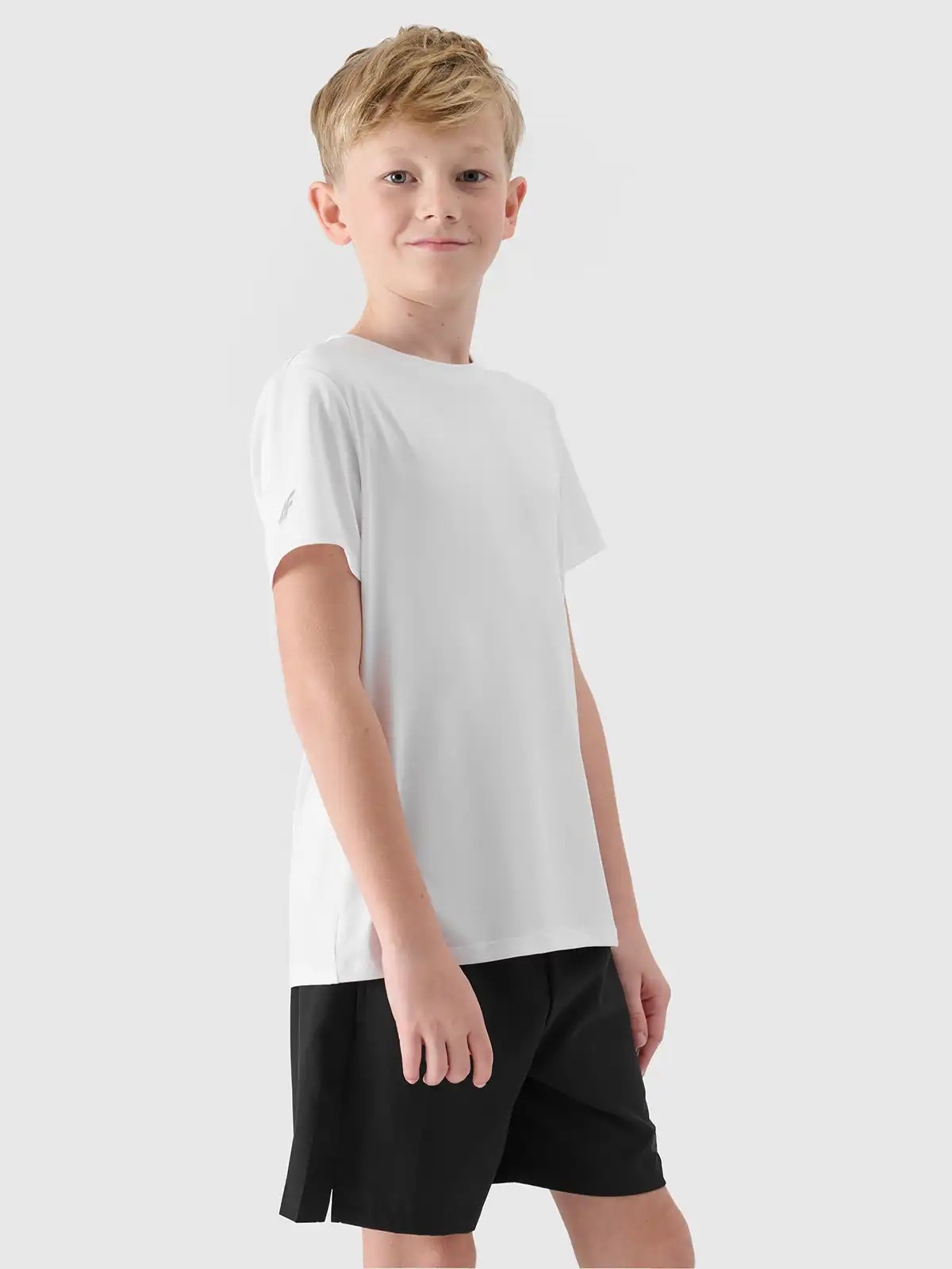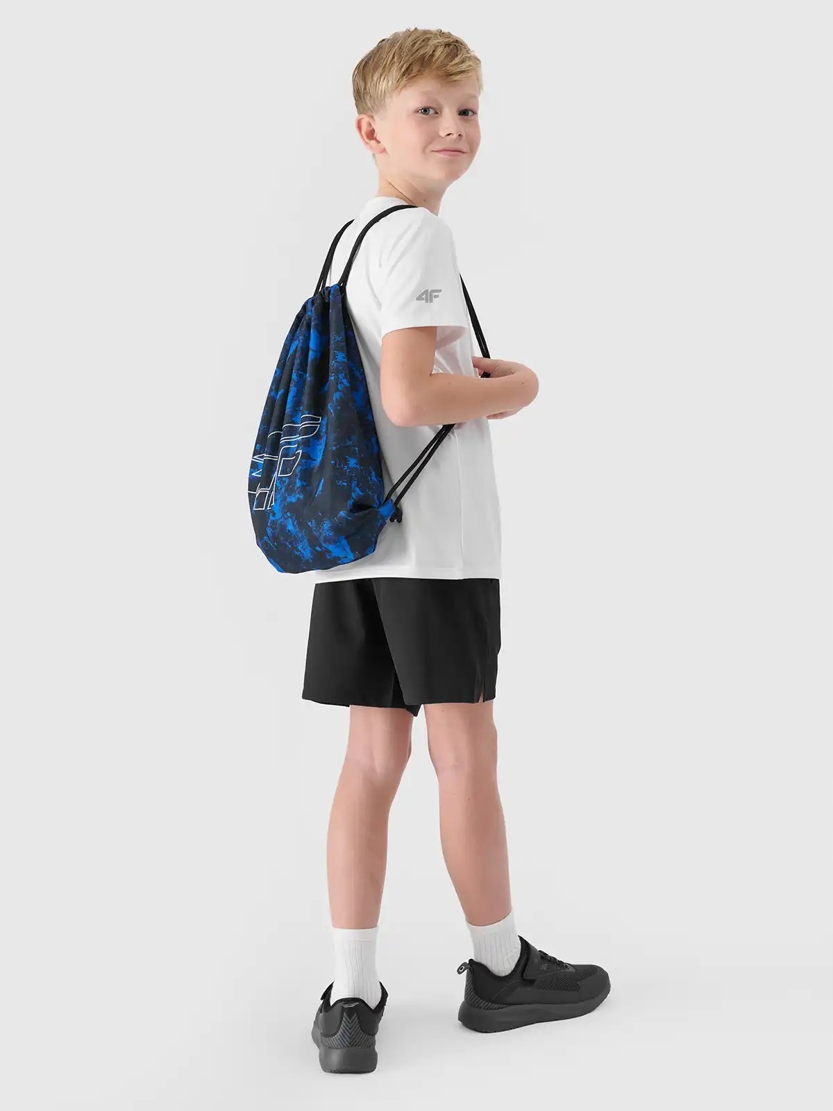 4f Sports 'Sports' Sports Sports является практическим решением для уроков PE и тренингов. включал в себя дышащую белую T -мала, удобные черные шорты и легкую синюю сумку.