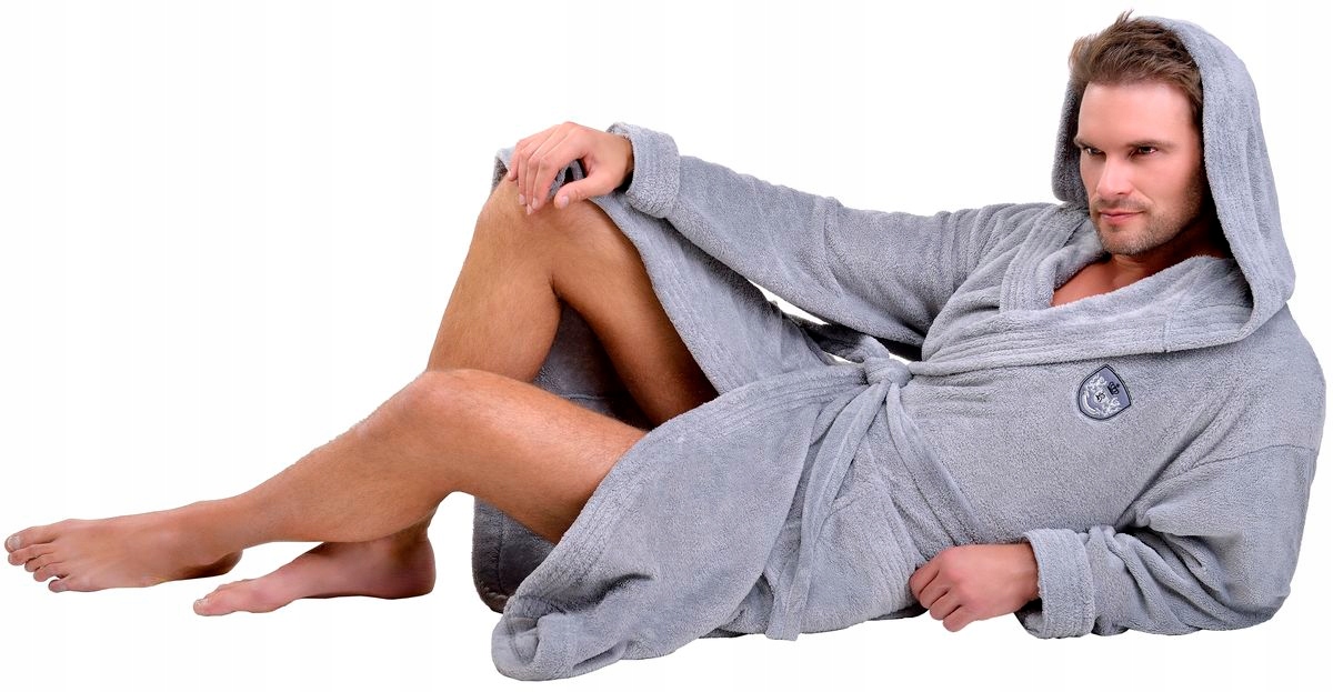 Халат мужской с капюшоном, завязывающимся на талии, из мягкой ткани, внешние карманы на бедрах, аппликация пришита на уровне груди. Приятна и приятна на ощупь, гарантирует удобство ношения.