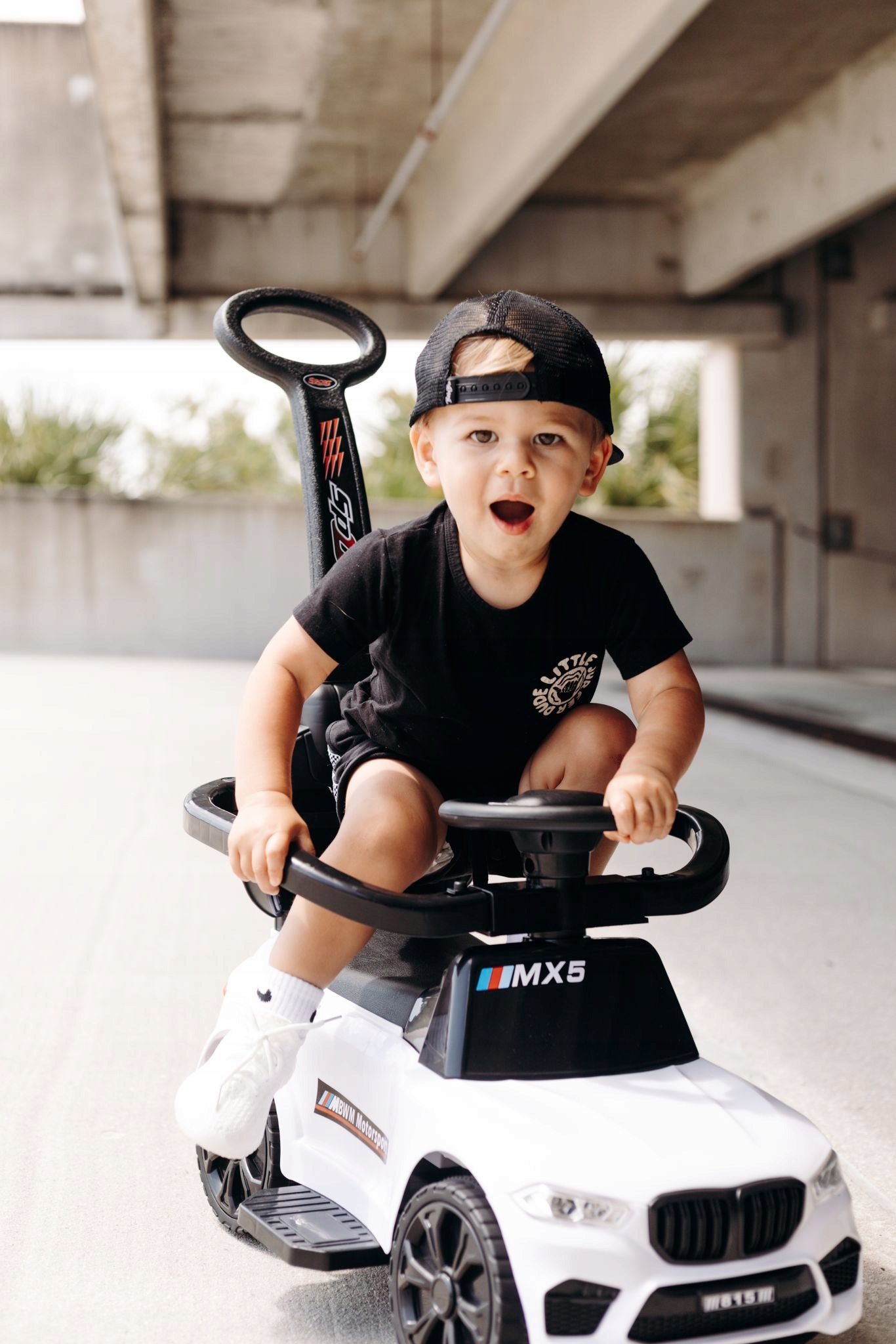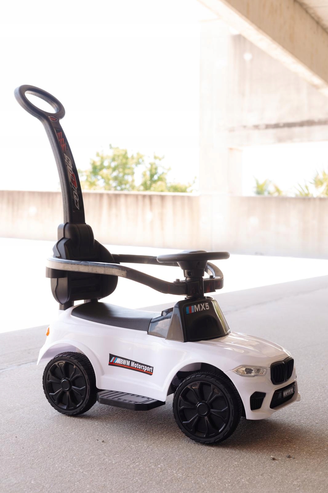 Jeździk sportowy MX5 z rączką do pchania dźwięki LEDy