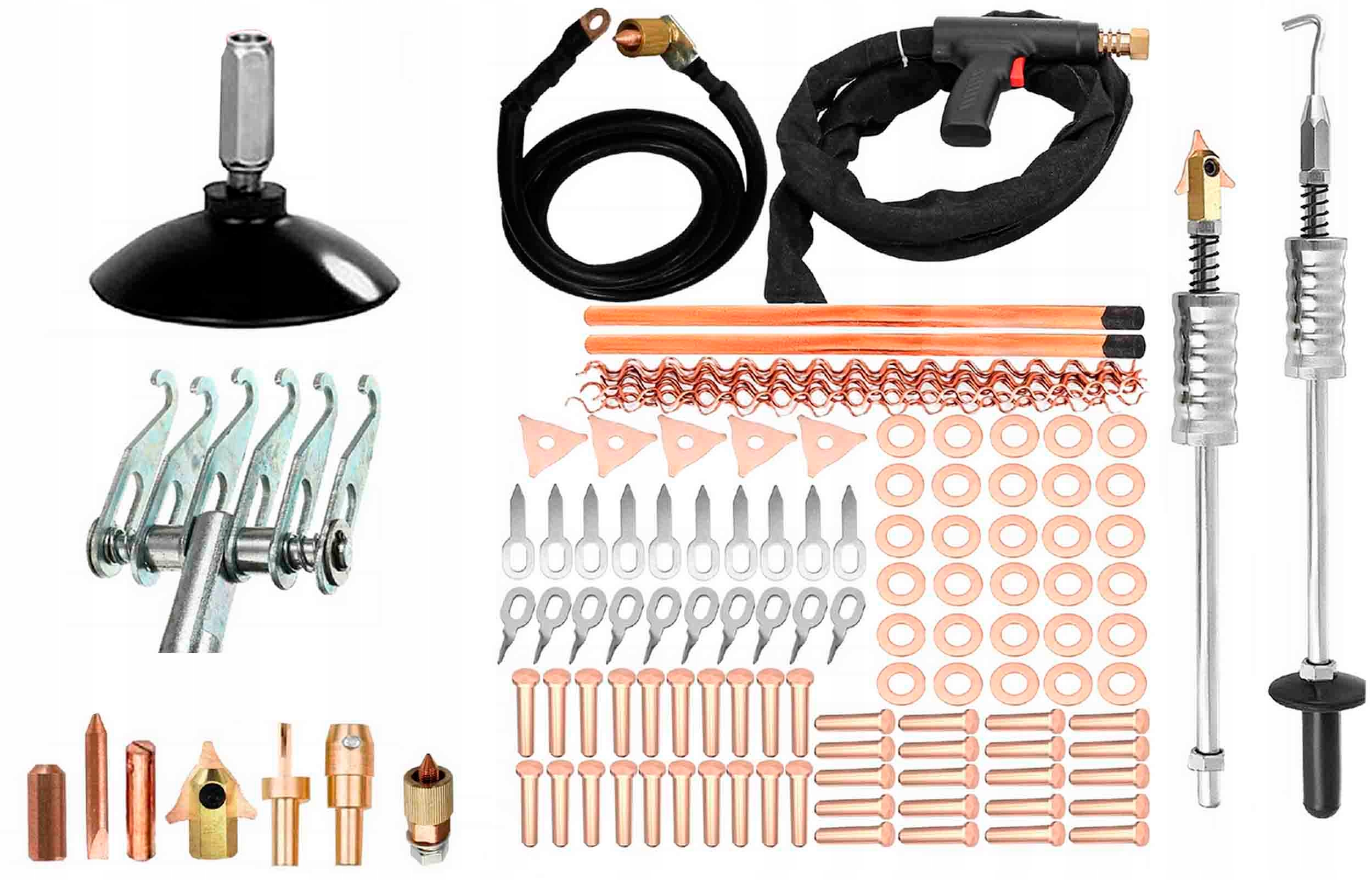 В комплект также входит аксессуары, необходимые для кузовного ремонта. Все упаковано в коробку с отделениями, благодаря чему все аксессуары находятся в одном месте. В комплект входят все необходимые аксессуары, такие как: шайбы, электроды, винты, гофрированная проволока и т. д.