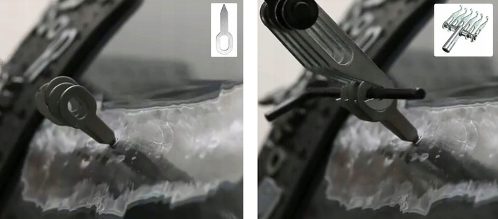 Удалить вмятины с помощью треугольных шайб очень просто. Просто нагрейте треугольный наконечник в поврежденный элемент и с помощью кинетического молотка «вытащите» вмятину.