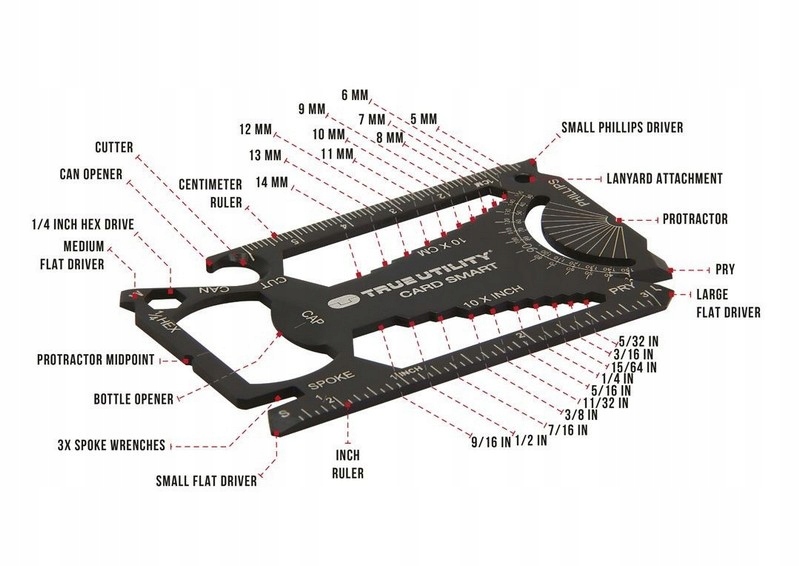 Он был изготовлен из черной нержавеющей стали, покрытой титаном. Он имеет потрясающий внешний вид и прочную конструкцию. Изделие помещается в ваш кошелек, поэтому вы можете иметь его под рукой в любое время. Он имеет следующие функции: крестовая отвертка, 3 отвертки с плоской головкой, 20 рожковых ключей (дюймовых и метрических), ключ для велосипедных спиц, мини-монтировка, консервный нож, открывалка для бутылок, измерительные ленты (дюймовые и метрические), транспортир.