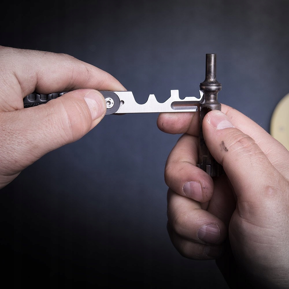 Скребок изготовлен из грунтовой нержавеющей стали, благодаря которой он легко справляется с грязью, не повреждая элементы оружия из более жесткой стали. Поворотная, прессованная обложка играет роль удобного сцепления