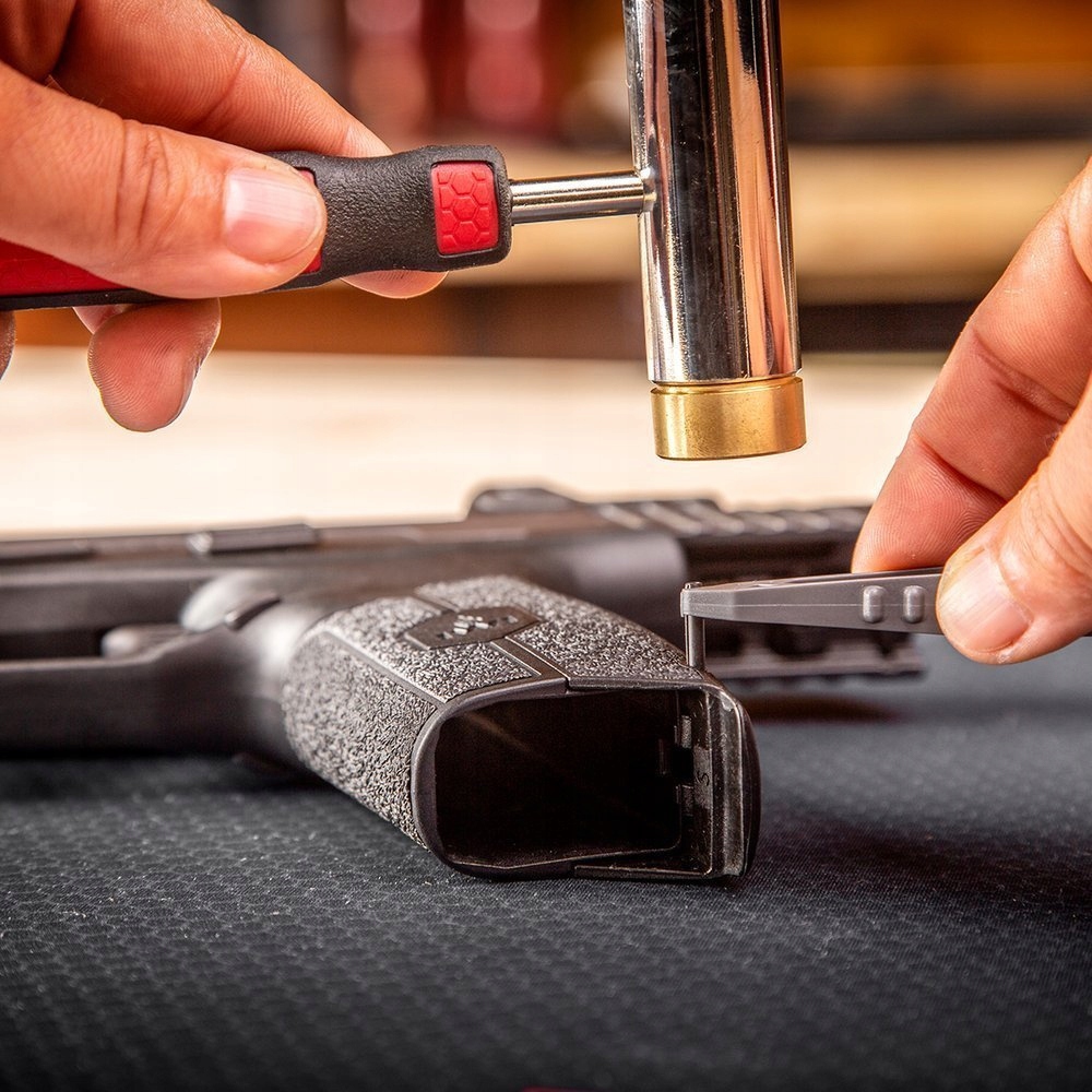 Accu-Punch Hammer с латунным и стальным пуншом-это набор, состоящий из молотка (с взаимозаменяемым подчиненным подвижностью различной твердости) и набора из 8 нокаутов для булавок из стали.